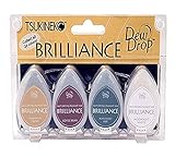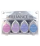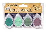 Tsukineko's Brilliance is a pigment ink that leaves a shimmery or matte (depending on the color) finish and dries naturally on vellum. Brilliance is ideal for stamping, stenciling and crafting applications such as cards, journals, scrapbooks, and more. Brilliance Dew Drop 4-pack are available in seven color sets. Use on paper, vellum, shrink plastic, polymer clay, wood and leather. Also available in full-size inkpads and Inkers.