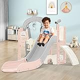 Virubi 6 in 1 Toddler Slide with Swing Playset, Climbing Toys Indoor Outdoor for Toddlers 1-3, Kid Slide with Swing with Climber Basketball Hoop & Telescope, Freestanding Baby Playground