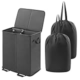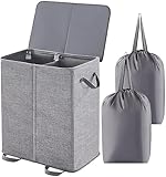 Two Large Compartments: With 2 large divided sections, you can easily separate darks and lights, clothing from linens, his and her items, or child and adult pieces. Two included laundry bags with handles fits onto the double hamper firm and tight with drawstring stoppers. Use the handles to easily pull out the removable laundry bags with dirty laundry for wash.