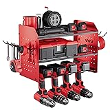 3-Layer Efficient Storage: Top layer 16"L×8.9"D for high cans, batteries; middle layer 16"L×8.9"D×4.9"H for toolboxes, power tools; bottom layer for 4 cordless drills; side pegboards with 4 hooks support 0.25" accessories for DIY storage