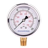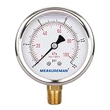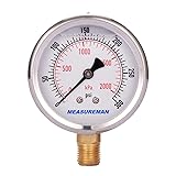 Description This liquid filled pressure gauge is designed for media which is not corrosive to brass, also where vibration and pulsation is a concern. Dial size: 2-1/2" Process connection: 1/4"NPT center back mount Case: 304 stainless steel case and crimped ring Window: Polycarbonate Dial plate: aluminum, with pointer stop Pointer: Aluminum, black, DIN style Boudon tube: Copper alloy Movement: Brass Connection: Brass, one piece design Oil cap: rubber, gray color Filling: Glycerin filled, dampens the effect of vibration and pulsation; lubricates the movement and extends the life of gauge. IP class: IP67 Accuracy: +/-3-2-3% Range: 0-200psi/kpa dual scale, psi outside, kpa inside Working temperature:-4 to 140 deg F/-20 to 60 deg C Ambient temperature:140 deg F/60 deg C maximum Measureman has 20 years rich experience in the measuring of pressure, temperature, flow, level industries, The "Measureman" branded products are the combination of continuous good quality and affordable price. "Measureman" products are selected and designed by professional engineers.