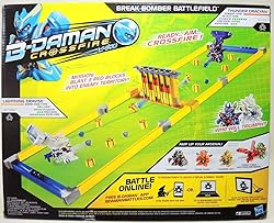 Product Description Ready, Aim, Crossfire! B-Daman battles are all about nonstop marble-blasting mayhem. You can be the battler you want to be by choosing the figure that best represents your personality and B-Daman fighting style. The Break Bomber Battlefield comes with everything you need for intense, head-to-head battles. It includes a complete arena with the Break Bomber set in the center, 2 B-Daman figures, 20 B-Da Marbles, and 2 Wide Magazine accessories for rapid-fire blasting. The Break Bomber Battlefield brings nonstop marble blasting and fun competition together in one ultimate arena. View larger Use the Power Type Thunder Dracyan to take on the Rapid-fire Type Lightning Dravise to see who can blast 3 red blocks in the other's territory first! To do so takes a mix of Power, Rapid-Fire and Precision skills. View larger Take your B-Daman battle into the virtual world by scanning your B-Daman figures with the free B-Daman App or entering the codes on the included collector cards at the bdamanbattles website. View larger Ultimate head-to-head competition. View larger Thunder Dracyan vs. Lightning Dravise. View larger Virtual battles. View larger Hasbro is committed to being an ethical and responsible company and is a recognized toy industry leader in the areas of product safety, environmental sustainability, ethical sourcing and philanthropy. Features: Thunder Dracyan vs. Lightning Dravise Chief Rivals Face Off Blast 3 Red Blocks in Enemy Territory 20 B-Da Marbles Total Target Obliteration Virtual Battles Take the Battles into the Virtual World Ages 6+ Includes An unassembled battlefield set, 25 blocks, 2 B-Daman figures, 2 Wide Magazine accessories, 1 customization tool, 16 B-Da Marbles, 4 Ultra B-Da Marbles, 2 collector cards, sheet of consumer-applied labels and instructions From the Manufacturer Ready, Aim, Crossfire. The Break Bomber Battlefield set includes everything you need to dominate the battlefield. Your mission: to blast 3 red blocks into enemy territory. Your unstoppable Thunder Dracyan figure's sturdy power shot will boom like thunder and blast your target. Strike with untamed speed with your rapid-firing Lightning Dravise figure. Each of your Wide Magazine accessories takes 10 marbles at a time, so you can do less loading and more blasting. Who will triumph in the end? Load up your marbles and start taking down your targets.