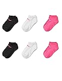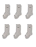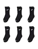 Description Nike Kids Boys' Size Chart Nike Kids Girls' Size Chart Nike® Kids keeps them comfy in the Dri-FIT™ Dri-Fit Performance Basic Crew socks. Sold as a pack of six. Dri-FIT™ fabric helps pull away sweat to help keep feet cool and dry. Arch compression for a supportive fit. Ribbed cuff sits above the ankle. Nike Swoosh™ logo. Reinforced heel and toe for durability. 47% cotton, 32% polyester, 19% nylon, 2% elastane. Machine wash cold, tumble dry low. Imported.