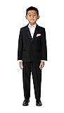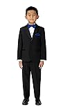 A complete tuxedo set paired with satin bow tie and handkerchief color of your choice. The tuxedo is tailored trimmer than our popular classic fit tuxedo. The suit has narrower lapel and slightly tapered waist, narrower through body and longer jacket length. The front upper pocket is sewn shut at delivery but can be opened to accomodate a hankerchief. Vest has adjustable strap at back. For size 2T-4T, pants has flat front and elastic back. For size 5 to 20, pants has button zipper front and elastic sides. 100% Polyester except dress shirt is 65% polyester and 35% cotton.