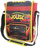 The Defender arcade messenger bag mimics retro game kiosks, including coin slots and cabinet art. It is made of durable polyester and has a unique screenshot top flap. Featuring a spacious main compartments with interior organization pockets and a zippered interior pocket and back exterior pocket, it also has a Custom interior lining based on the classic Midway arcade game.