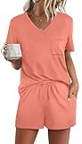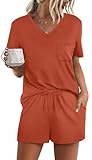 RUBZOOF Pajamas for Women Short Sleeve Casual Summer V Neck 2 Piece Pjs Sets Loose Fit Soft Sleepwear Orange 2XL