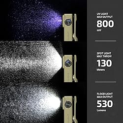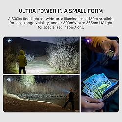 [Three-in-One Flashlight] Oclip Ultra combines 530 lumens floodlight, 130 meters range spotlight, and 800 mW UV light into one flashlight, ideal for night work, hiking, and other similar activities