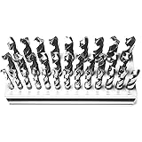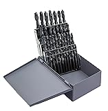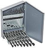 Drill America 25 piece 118 degrees conventional point general purpose drill bit set comes in a metal case. This dependable drill designed to perform in a broad range of materials in the iron and steel families. Ideal for production, maintenance or portable drilling jobs. High-speed steel tools are good for most general purpose applications, offering a combination of hardness and toughness for wear resistance. Black oxide treatment adds lubricity and creates small pockets on the surface of the tool that act to hold coolant near the cutting edge. Round shanks allow use with a wide variety of toolholding systems. When run in a counterclockwise direction (right-hand cut) spiral fluted tools evacuate chips up and out of the cut to reduce clogging. Set includes metric sizes: 1 - 13 mm x 0.5 mm.