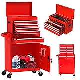 Enhanced Functionality: Featuring five drawers and a versatile setup, this rolling tool chest includes multifunctional handles and an internal adjustable shelf to cater to diverse tool storage needs. The configuration supports high functionality with features like ball guide rails for smooth drawer operation and a door with hook holes for additional hanging storage.