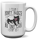 15oz White Mug with the following text: Team Honey Badger - We Take What We Want Introducing our unique coffee mug for honey badger fans! This mug is perfect for animal lovers who want to take a break and enjoy their favorite hot beverage. With its shining double-sided print it is suitable for right-handed and left-handed people and is ideal for everyday use at home or in the office. The large handle makes it convenient and easy to carry and prevents accidental spills. Treat yourself or badger fan you know with this expertly designed coffee cup. It is the perfect gift for any special occasion. You can further personalize the present by adding small goodies such as magnets, candy, or even small letters inside. So why wait? Order today! PRODUCT DETAILS: - Material: high quality ceramic - Dishwasher safe - Microwave safe - Main color: white