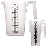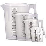 Pack of 4 - 2 Liter (2000 ml) sturdy plastic measuring and mixing cup pitchers. Each pitcher holds over 1/2 of a gallon (2 quarts) with a 72 fluid ounce capacity. The pitcher's stack and store easily because of the spout design and the open handles.