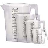 Pack of 4 - 3 Liter (3000 ml) sturdy plastic measuring and mixing cup pitchers. Each pitcher holds over 3/4 of a gallon (3 quarts) with a 108 fluid ounce capacity. The pitcher's stack and store easily because of the spout design and the open handles.