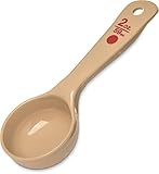 This Carlisle 433006 Measure Miser 6 oz. beige plastic spoon is a solid portion control spoon for measuring liquid, wet, and solid ingredients. It is made of polycarbonate for resistance to detergent, stains, acids, and breakage, and has a black color-coded dot and lettering for visual identification of the spoon's capacity. This portion control spoon has a flat bottom for spreading sauces and toppings. It is suitable for temperatures up to 212 degrees F, withstands dry heat up to 270 degrees F, is dishwasher-safe, and meets NSF International/American National Standards Institute (ANSI) Standard 2 for food equipment. This spoon is 8.62" long. Carlisle manufactures food service equipment and supplies and sanitary maintenance tools and supplies for commercial, industrial, and institutional facilities. The company, founded in 1954, is headquartered in Oklahoma City, OK.