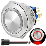 Package include : 1* 30MM Big Push Button Switch 1* Wire Connector Sockets 1*Spare Contact What's Momentary Switch: Momentary switch, Push & Hold, ON; Release, OFF The super large diameter of the head of the button is 33.8MM. What's the Wire Connector: With the wire connector, you don't need to solder the terminals, make installing very easy Saves the issue of soldering to the switch, and possibly melting it as well You can replace the switch anytime by just unplugging the switch from its socket What's Momentary Switch Used for: Great for electromagnetic starter, relay, Doorbell, Horn Button Switch, PC Power Switch or any circuit controls What's Note: -These switches come with a rubber O-ring which makes them splash resistant but they can NOT be submerged underwater -The project you are going to be used for, don't let current go above 5 amps. Or the switch will get warm and to be burned out What's Customer Support: If you have any questions, feel free to contact us by E-mail any time. We get professional customer service staff and technician to help you Specifications: Head diameter:1.33“/ (33.8mm) Mounting hole size: 1.18"/ (30mm) Total length:1.6" (40.6mm) Switch combination: 1NO1NC (SPDT) / 2NO2NC(DPDT), The default is 1NONC. If 2NO2NC is required, you can add contacts manually. (Another contact NONC is given as a gift) Switch rating: 5A/250VAC LED rating: 15mA, AC/DC 12V Head shape: Flat Head material: 316 Stainless Steel Enclosure material: 304 Stainless Steel Protection level: IP67, IK10