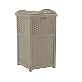 Elevate your outdoor space while maintaining cleanliness with the Suncast 33 Outdoor Wicker Trash Can for Patio. Featuring a decorative wicker-style design, this porch trash can blends seamlessly into any patio, deck, or garden area, offering an attractive solution for waste management. Its 33-gallon capacity works with standard 30-gallon garbage bags, ensuring convenient and hassle-free usage. The hinged lid with a secure latch keeps garbage contained and deters pests, while its durable, weather-resistant resin construction provides protection against fading, cracking, and water damage. Measuring 16" W x 15.75" D x 31.7" H, this compact trash can delivers substantial storage without taking up too much space, making it an ideal addition to any outdoor setting.