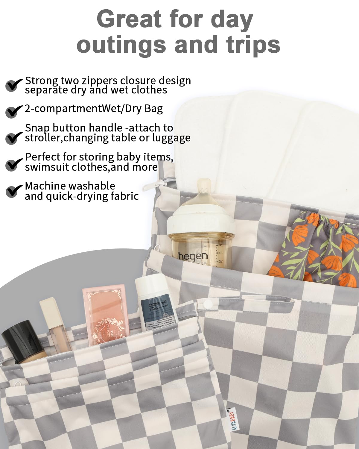 ALVABABY Wet Dry Bags: Truly wonderful bags that allow you to carry your wet and dry items in the same bags. Each bag contains a "wet" section that is sewn and sealed for no wicking or leaking AND a zippered dry section for keeping dry diapers or inserts. Carry all your items in one bag while keeping your items dry and your wet or soiled items separately. Truly all in one bags! Features: 1,Fashion&Stylish, Reusable&Waterproof, High quality: A trim and attractive design. ALVABABY wet/dry bag are made from waterproof 100% polyester, put dirty cloth diapers in a wet bag. Comes with SNAP handle for easy carrying or attaching to your diaper bag or stroller. 2,Double Zippered: TWO Zippered compartments for keep wet and dry things separate. Each bag contains a "wet" section that is sewn and sealed for no wicking or leaking. 3,Enough Space: 30cm x 36cm (approx.:11.5 in x 14 in),Holds approximately 5-7 cloth diapers. Light weight, easy to carry (less than 50 g). 4,Multi-functional Bags: A truly wonderful bag that allows you to carry your wet and dry items in the same bag. Carry all your items in one bag while keeping your dry items dry and your wet or soiled items separate. Truly an all in one bag! They can be used as diaper wet dry bags, travel bags, storage bags, cosmetic bags, handbags, wash bag, organizer bags. Also great for swimming suits or other wet items.