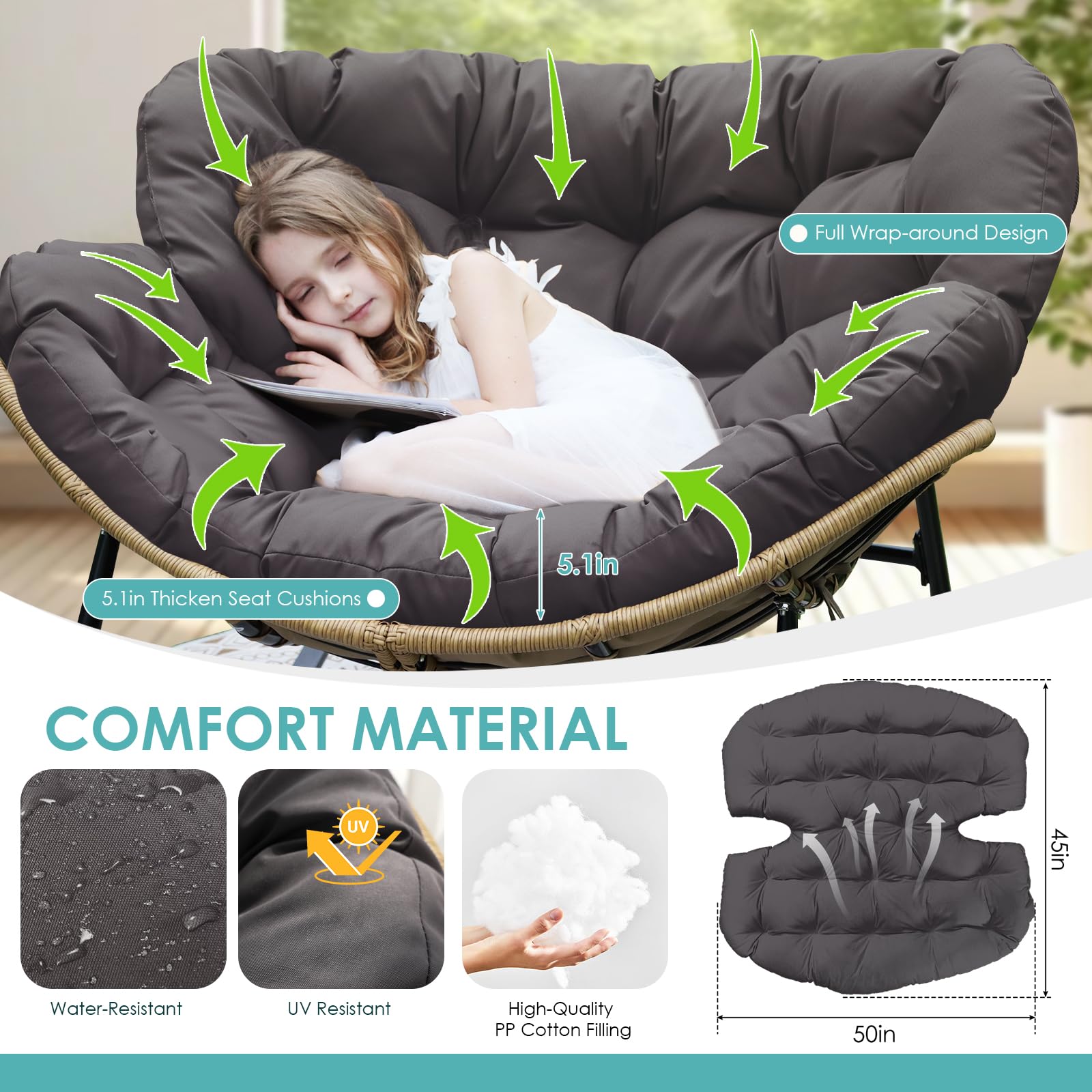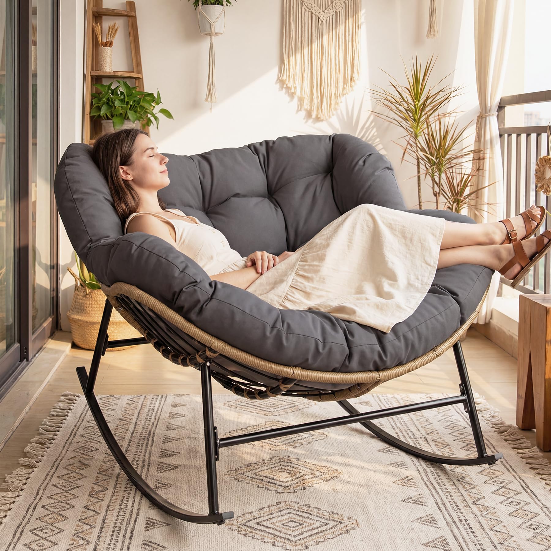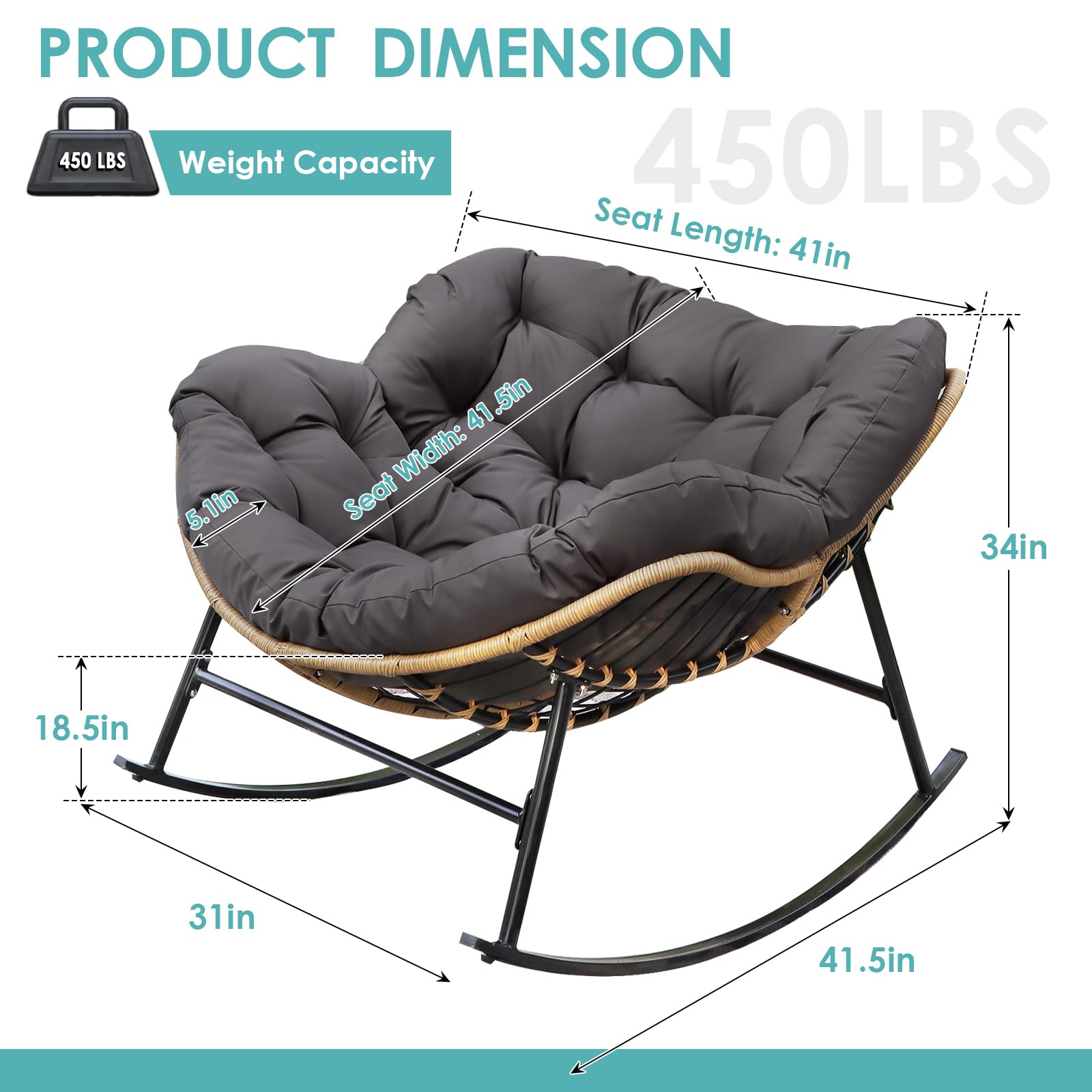 Heavy Duty Stability: Built with a reinforced alloy steel frame and treated with e-coating for superior resistance to outdoor elements, this large rocking papasan chair supports up to 450 lbs; the engineered base creates a smooth 30-degree rocking motion, combining the sturdiness of steel with the soothing glide of ergonomic design; compared with lightweight chairs, this structure feels stable and secure, ensuring years of reliable use on patios, decks, or indoor spaces without wobbling