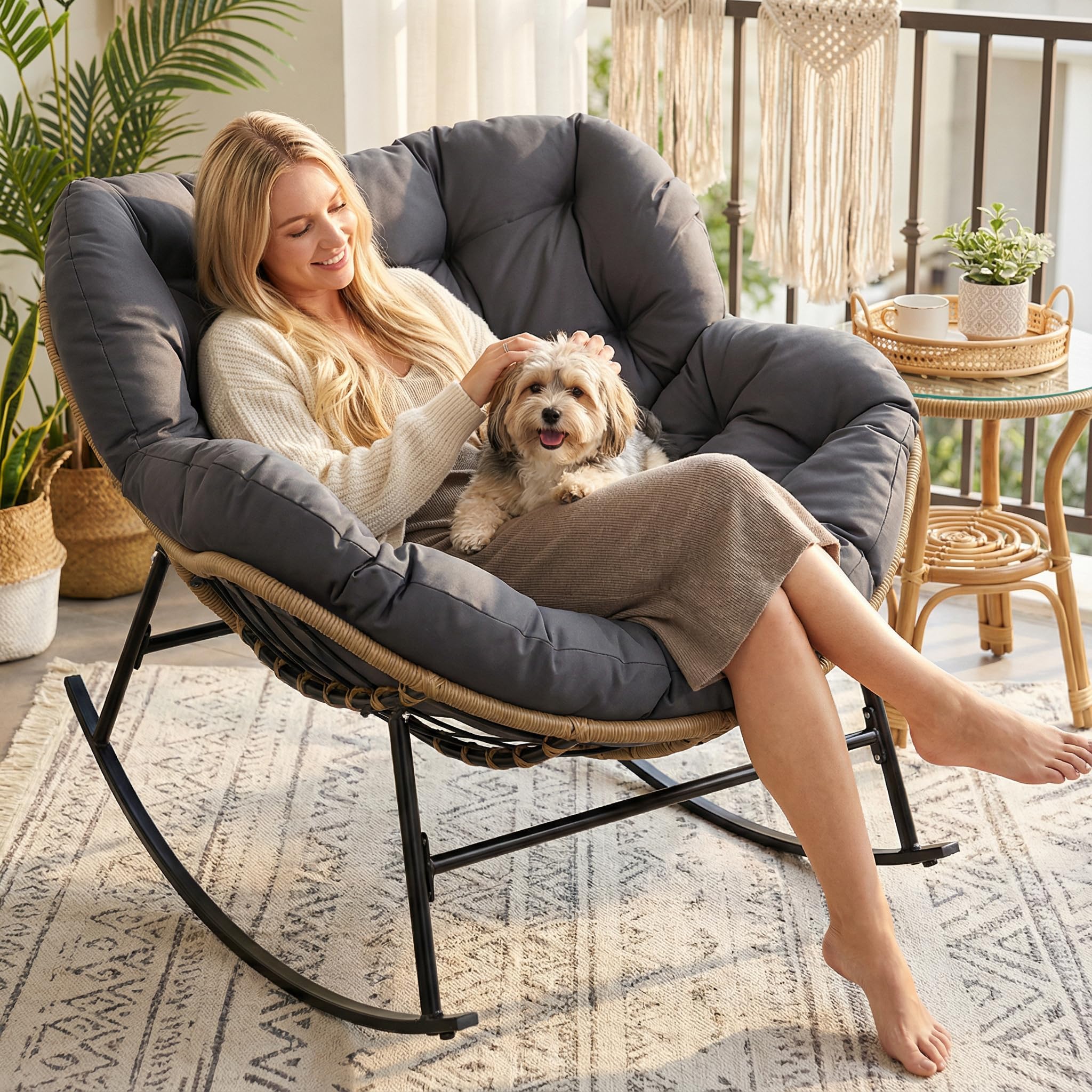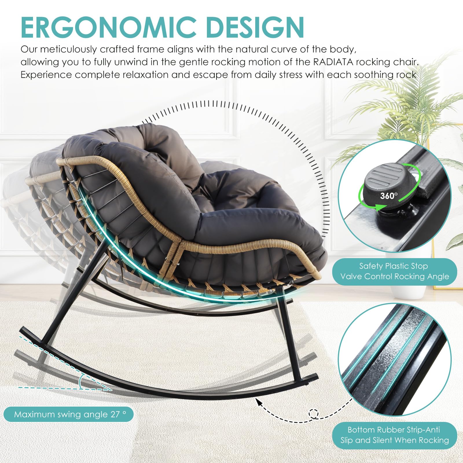 Ergonomic Comfort Cushion: RADIATA Papasan rocking chair enjoy generous seating with dimensions of 41.5 inch × 41 inch, paired with a 5.1 inch thick padded cushion that offers cloud-like softness; the ergonomic egg-shaped frame naturally follows body curves, while the box-stitched cushion supports posture and prevents sagging; this thoughtful design reduces pressure on back and hips, letting you curl up, stretch out, or recline comfortably; ideal for relaxed reading, evening tea, or weekend lounging on the patio