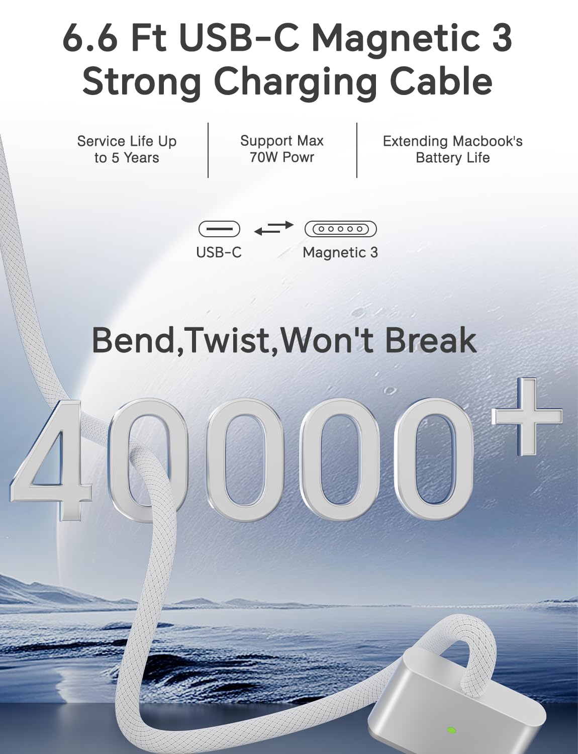 Enhanced Battery Protection: The USB-C to Magnetic 3 cable, equipped with advanced dynamic software and hardware, intelligently adapts to your charging routine, effectively reducing battery wear. Compared to traditional USB-C to USB-C connections, this 70W charger utilizes top-grade electronic components, providing superior battery health protection and extending battery lifespan by up to 2x, ensuring a longer-lasting, safer charge for your MacBook.