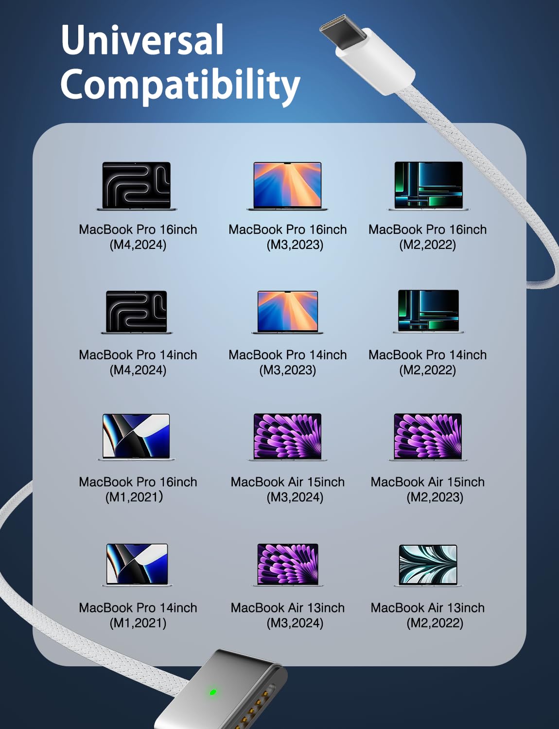 Extensive Compatibility for MacBook Models: Perfectly compatible with a wide range of MacBook devices, including MacBook Pro 16-inch (M3, M2, M1) and MacBook Pro 14-inch (M3, M2, M1) from 2021 to 2023, as well as MacBook Air 13-inch and 15-inch (M2, M3) models up to 2024. This charger is also suitable for models a2442, a2485, a2458, a2452, a2681, a2779, and a2780βoffering a comprehensive charging solution across all your MacBook devices.