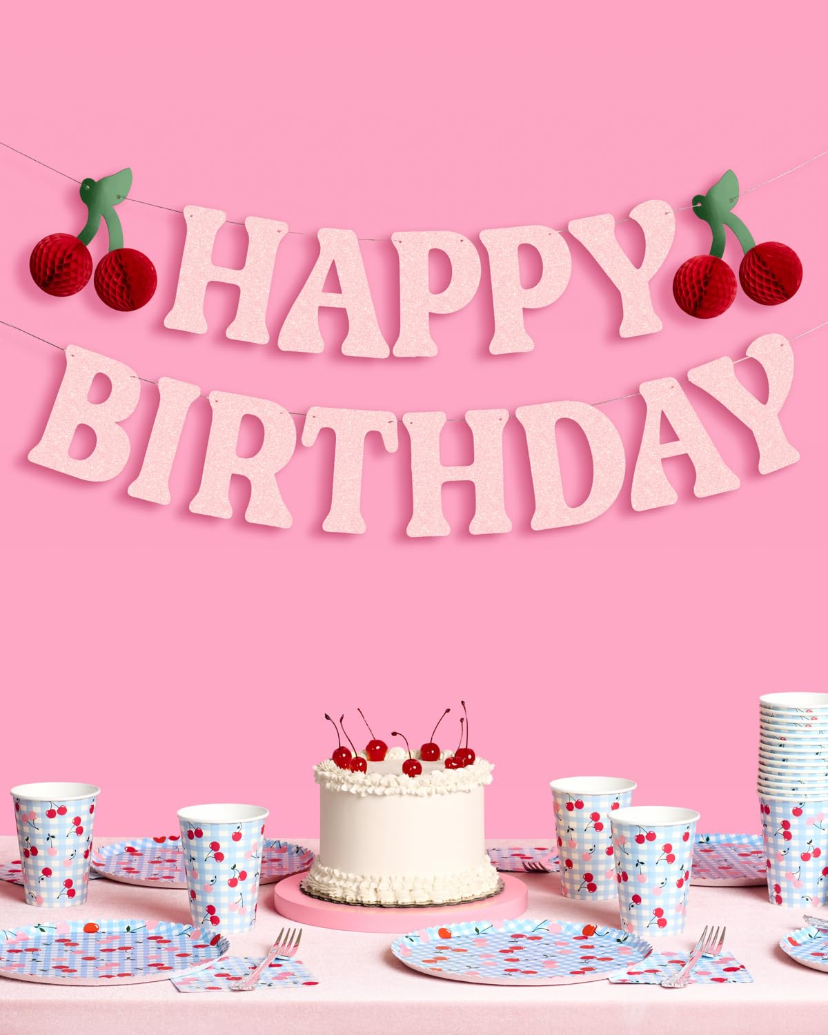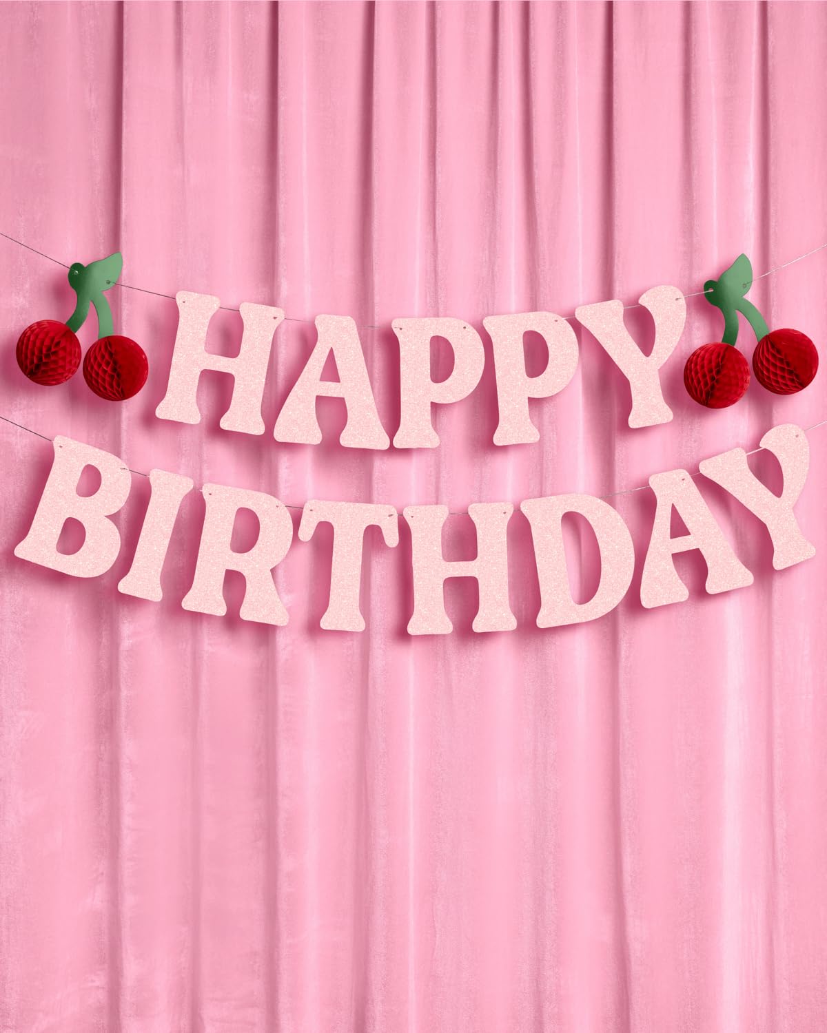 Sweet As Cherries: "Happy Birthday" in bold, light pink glitter lettering for a fun, sparkling celebration. This banner is the party addition you've been looking for + a guaranteed hit!