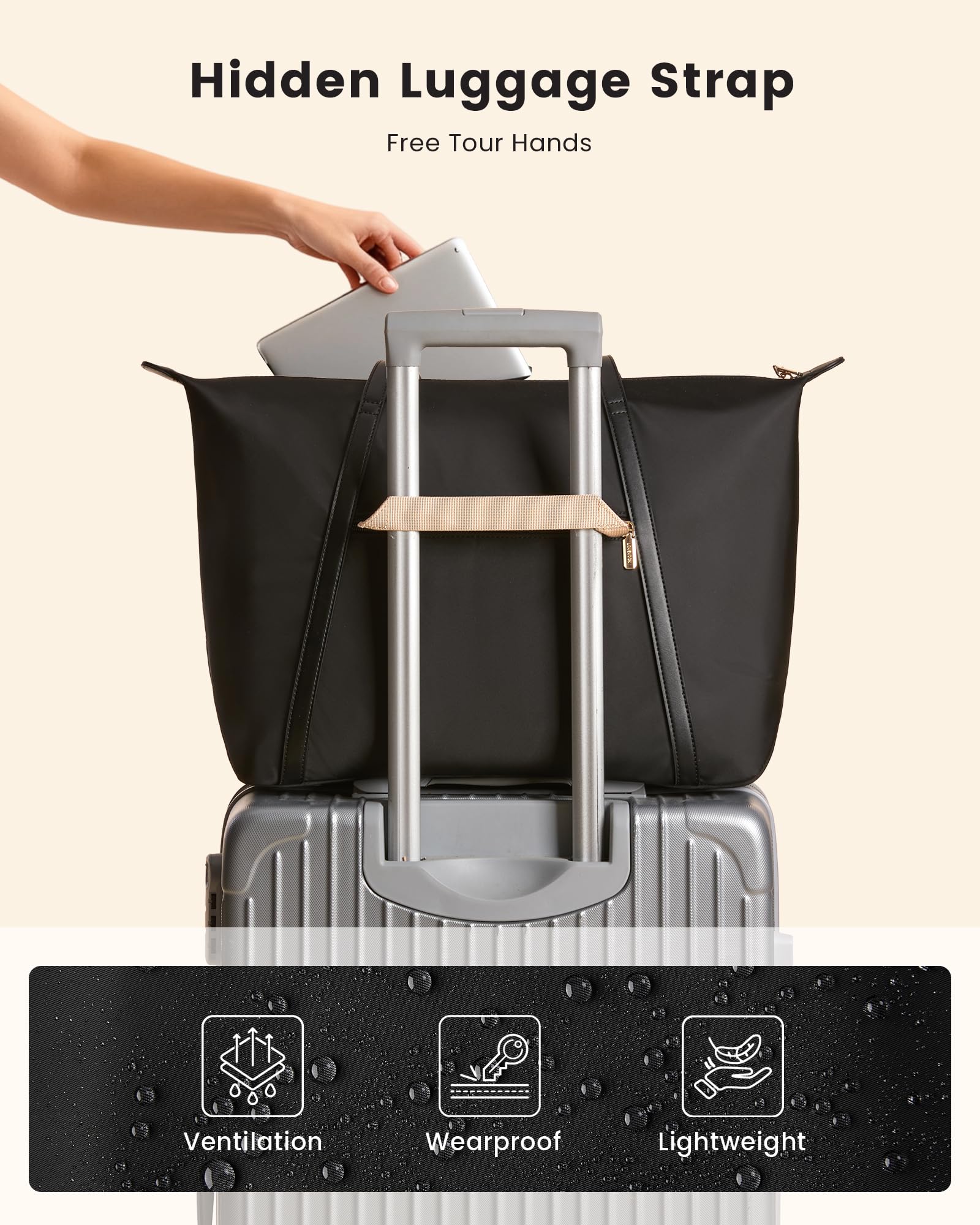 Work & Travel-Friendly:The STRAPS on this work bags for women are smooth, soft, and easily adjustable. The LUGGAGE STRAP is hidden in the zipper pocket in the back, and you can use that pocket to briefly store your passport, phone, license, etc. through security. Very helpful. What sets this laptop purse bag apart from so many other large tote bags is that it has FEET, so the purse itself never touches the surface where you're placing your bag down.Feet protect the bottom of the bag.