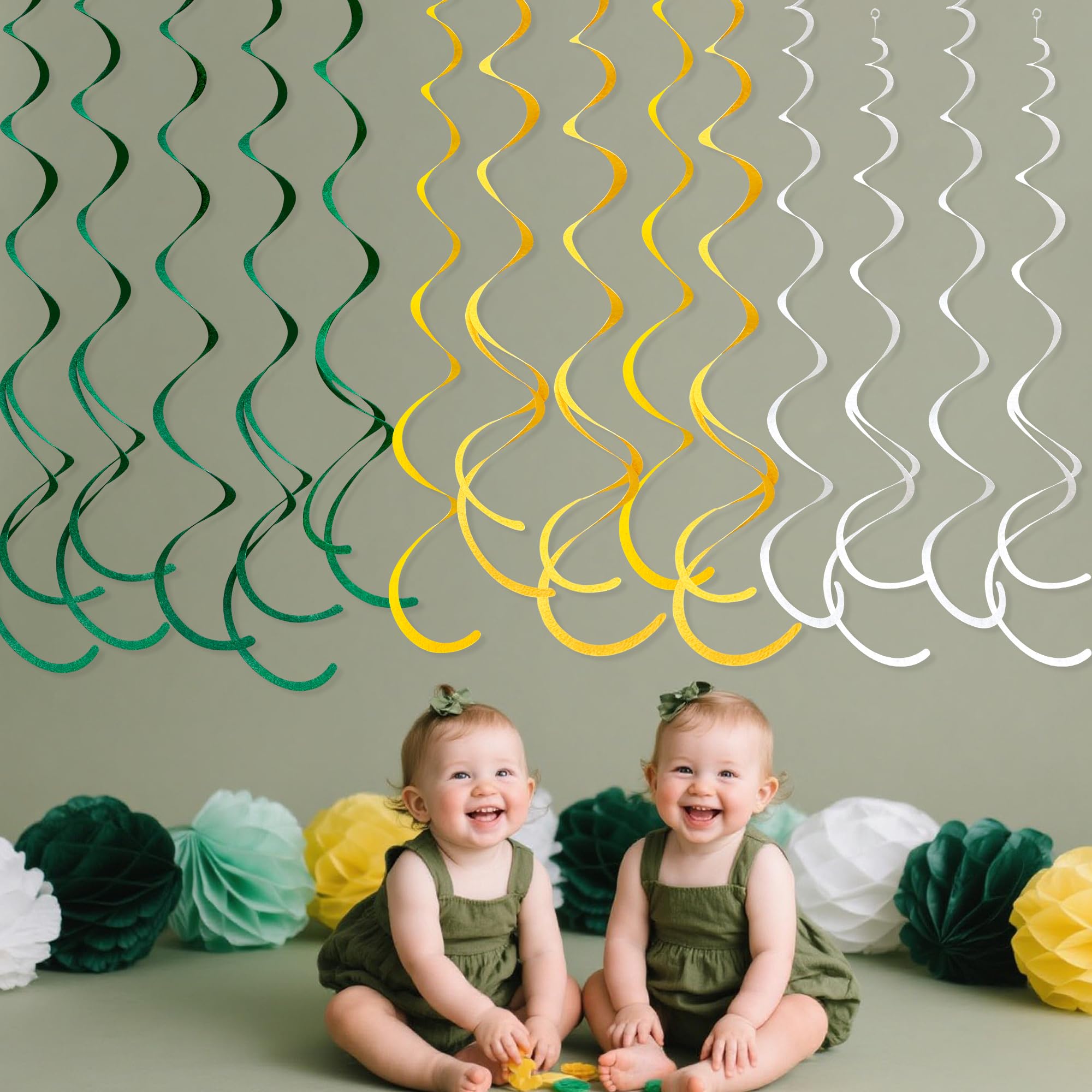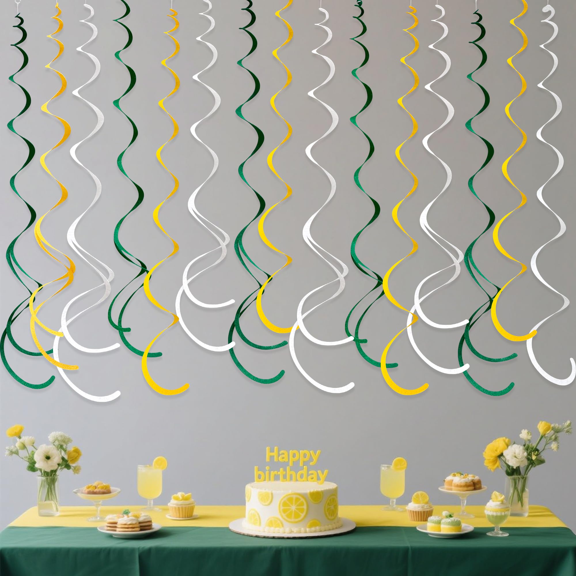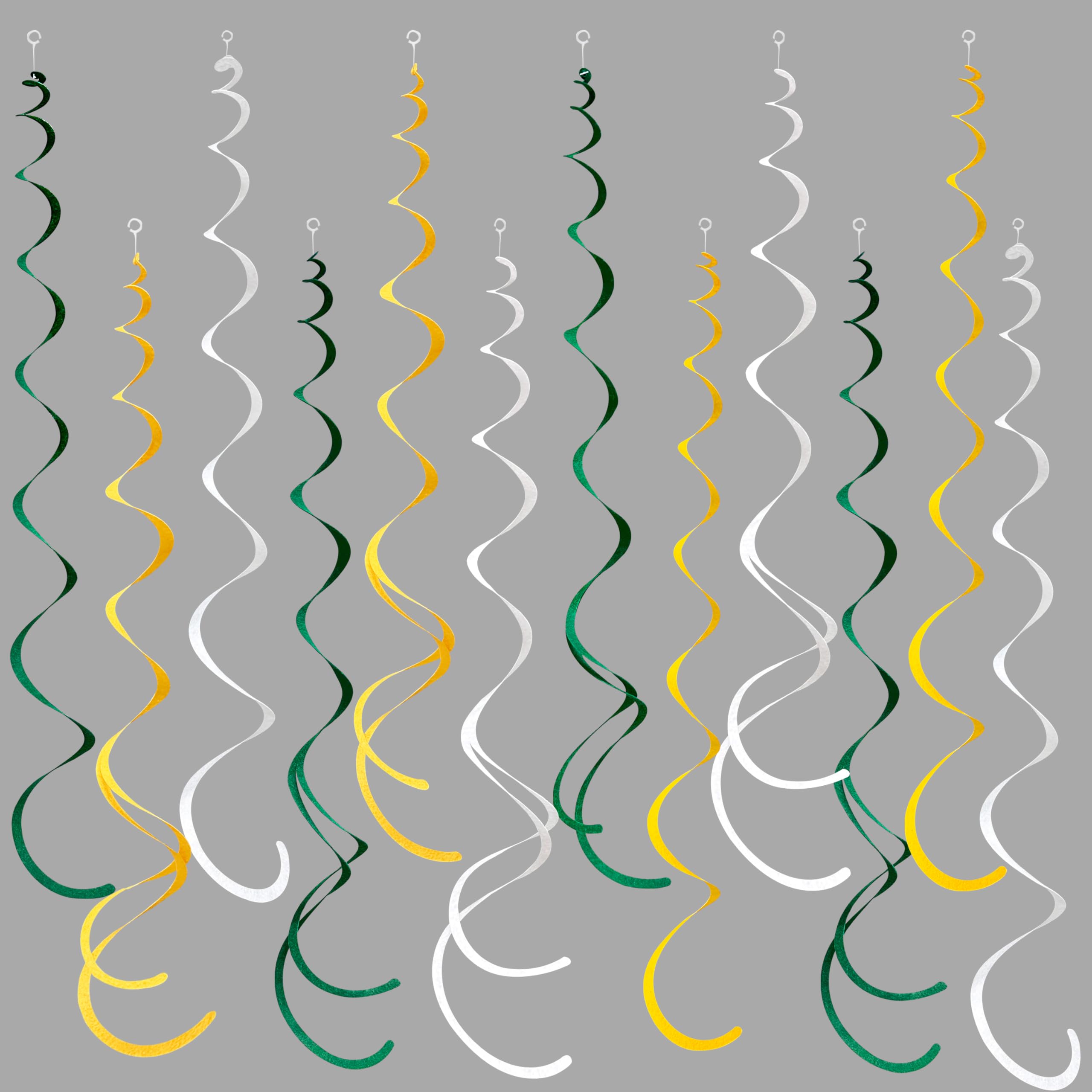 Package Contains - 36 packs of yellow green white color swirl party streamer, Each swirl can extends to approximately about 2.62 feet long,Meeting daily general needs.Comes with 40 plastic hooks for hanging.