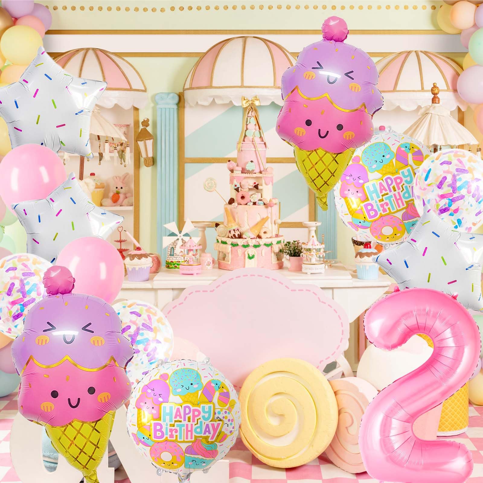 Dreamy Design: This pink ice cream-themed party balloon set beautifully showcases sweet ice cream patterns, featuring balloons in various colors and shapes that add a whimsical and joyful atmosphere to your party