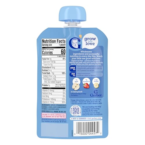 Our Gerber Apple Strawberry Banana Puree Pouch is crafted with wholesome ingredients, making it a premium choice for your little one. This fruit pouch has 30% of the daily value of vitamin C and two servings* of fruit. These stage 2 Gerber baby food pouches are designed for babies who are ready to explore new textures and flavors, making them a great addition to your baby's diet. Gerber baby food understands the importance of providing wholesome food as your baby grows and develops. Our Gerber baby food fruit pouch is ideal for parents who seek quality in their baby's diet. *1 fruit serving is 3 tbsp for babies