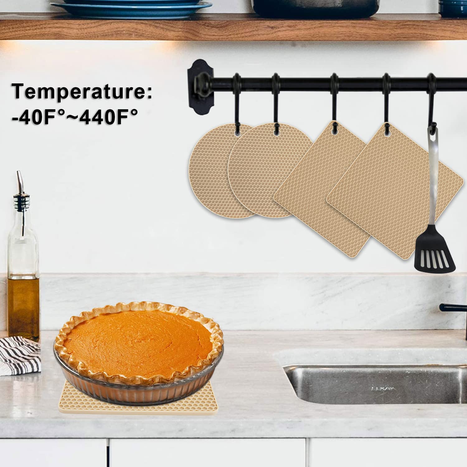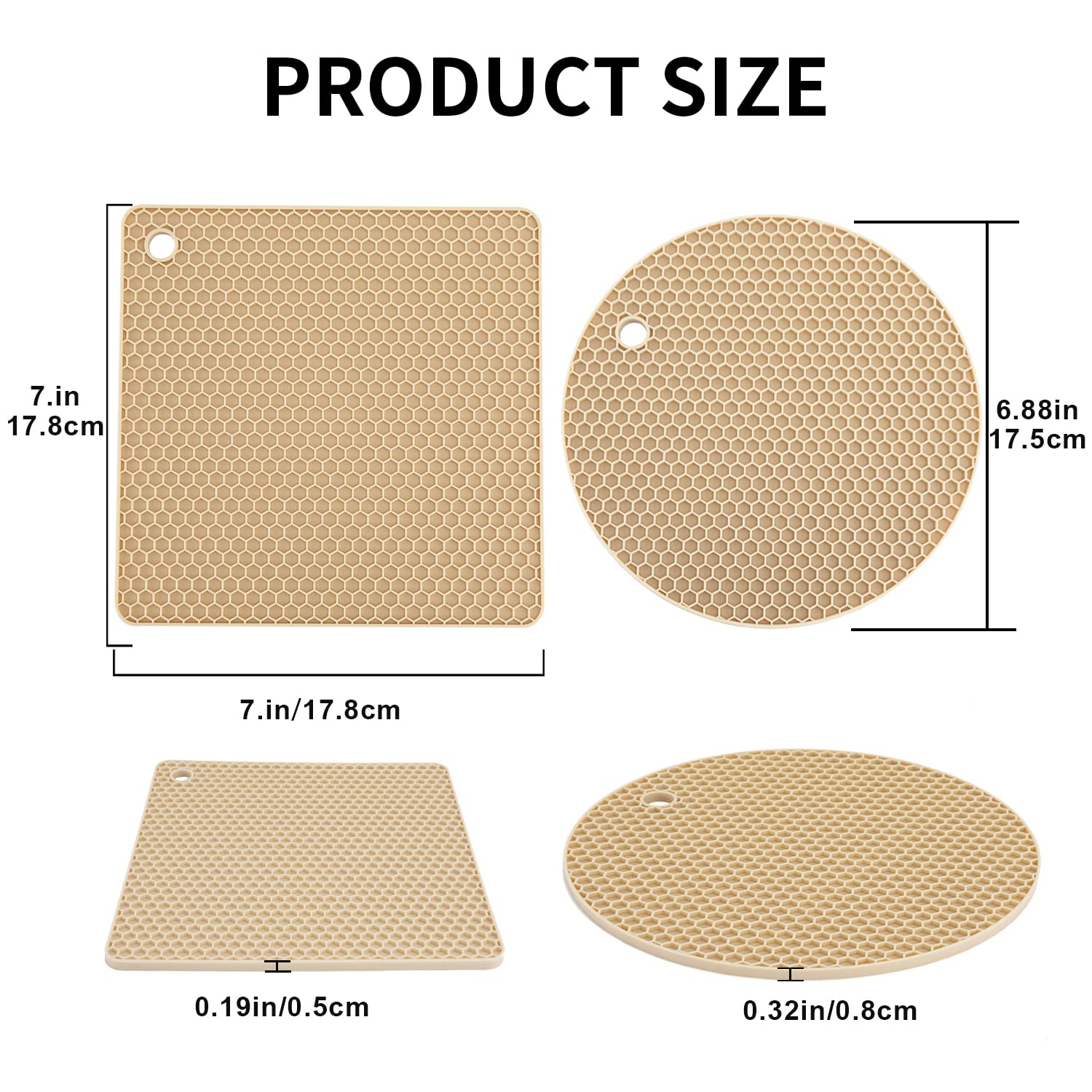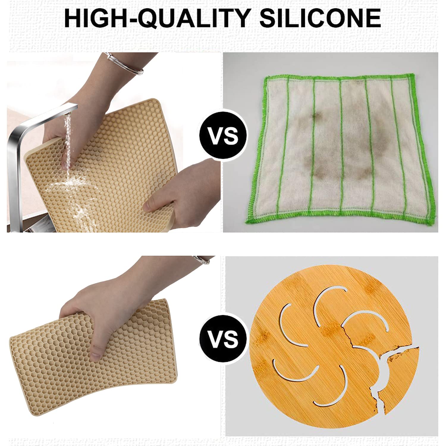 🥘Heat Insulation & Safe to Use -The Heat-resistant temperature is: -40℉ to 446℉. The silicone trivets protect your kitchen countertop from being damaged, you can directly put the hot pot from the stove on the tabletop; used as pot holder and handle protector to protect the hand from being burned.
