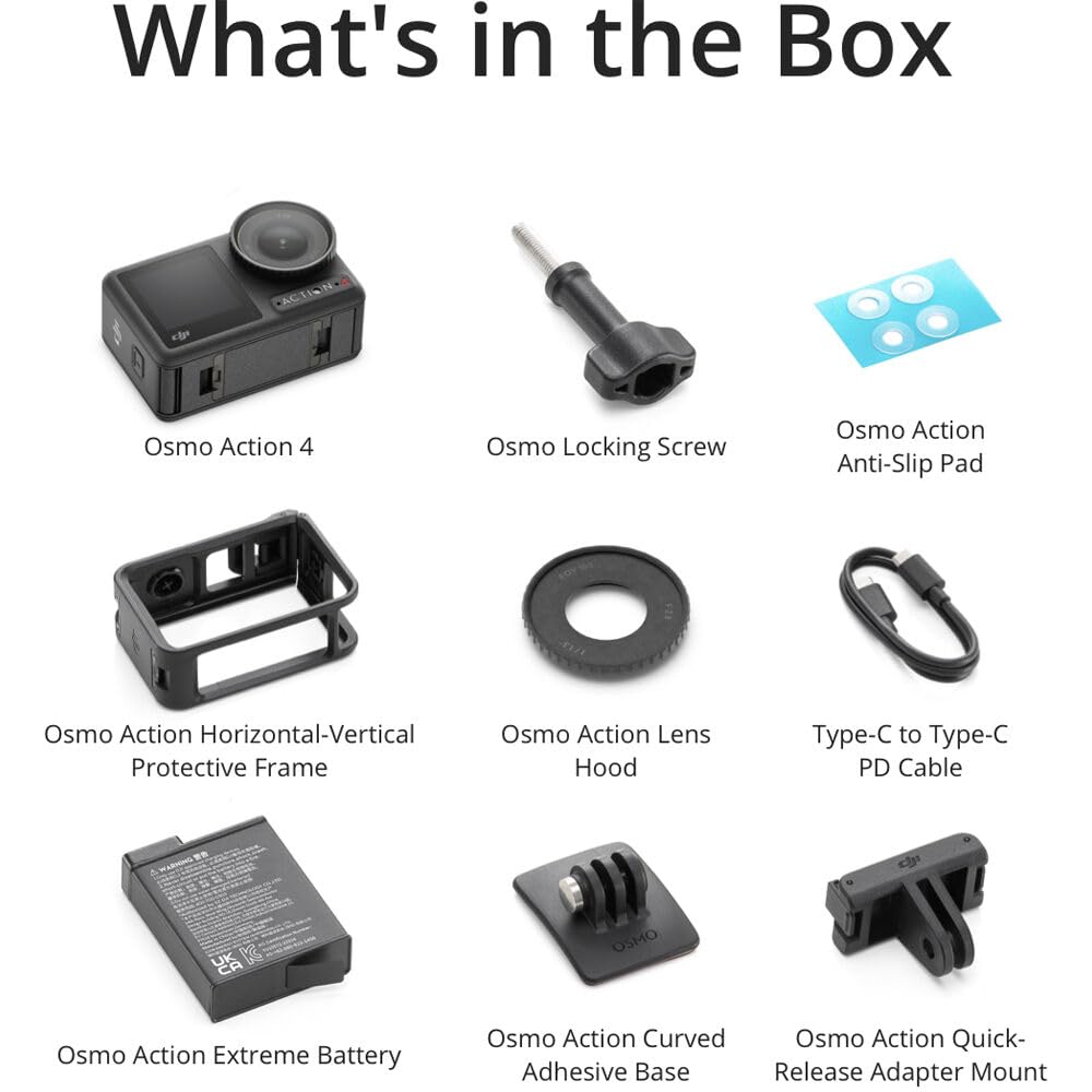 The DJI Osmo Action 4 Camera Standard Combo is built for adventurers, offering UHD 4K120 video with a 1/1.3" sensor and a super-wide 155° FOV to capture smooth, detailed footage. The 10-bit D-Log M color mode delivers over a billion colors and a wider dynamic range, while the color temperature sensor ensures accurate colors, even underwater. RockSteady 3.0 and HorizonSteady stabilization keep your footage steady through intense activities, with HorizonBalancing maintaining level video in 4K60. Switch seamlessly between mounts with the magnetic quick-release design and shoot natively in vertical mode for social media. Dual touchscreens enable easy framing and controls, even with wet hands, while voice control ensures hands-free operation. Record for up to 2.6 hours with the 1770mAh battery, which fast-charges to 80% in 18 minutes and works in temperatures as low as -4°F. Waterproof to 59' and equipped with AI-powered InvisiStick for selfie stick removal, the Action 4 is your go-to camera for capturing dynamic, high-quality footage wherever you go. Manufacturer Included Items: DJI Osmo Action 4 Camera Standard Combo DJI Extreme Battery for Osmo Action 3 and 4 Horizontal/Vertical Protective Frame Quick Release Adapter Mount Curved Adhesive Base Locking Screw USB-C PD Charging Cable Lens Hood Anti-Slip Pad Logo Sticker Bundle Items Include: DJI Osmo Action 4 Camera Standard Combo - WaterProof Action Camera With 4K UHD Video, 1/1.3" Sensor, Stabilization, Dual Screens, For Vlogging, Travel & Sports 1 x 50-in-1 Action Accessory Kit 1 x 32GB microSDXC Memory Card 1 x MicroFiber Cloth
