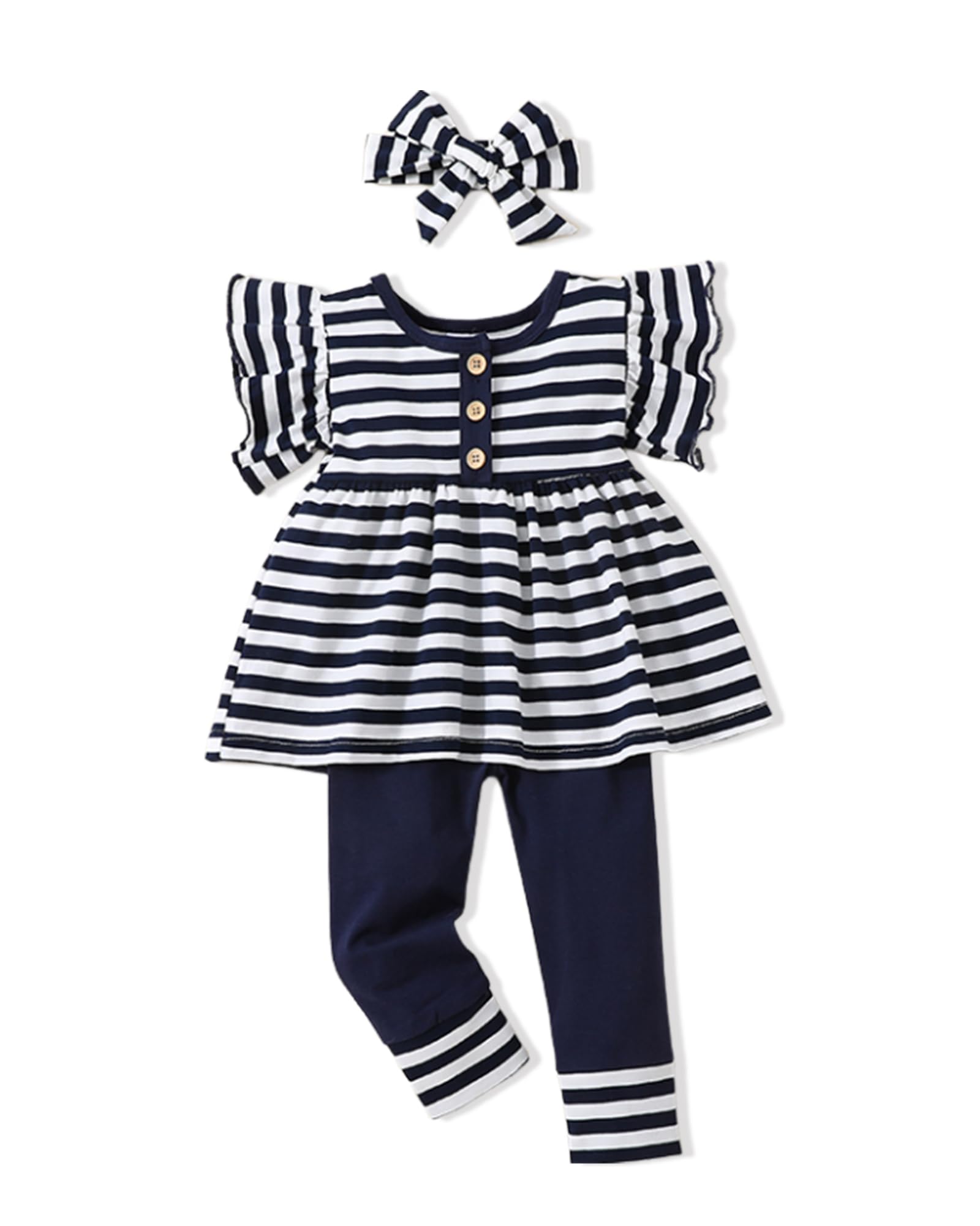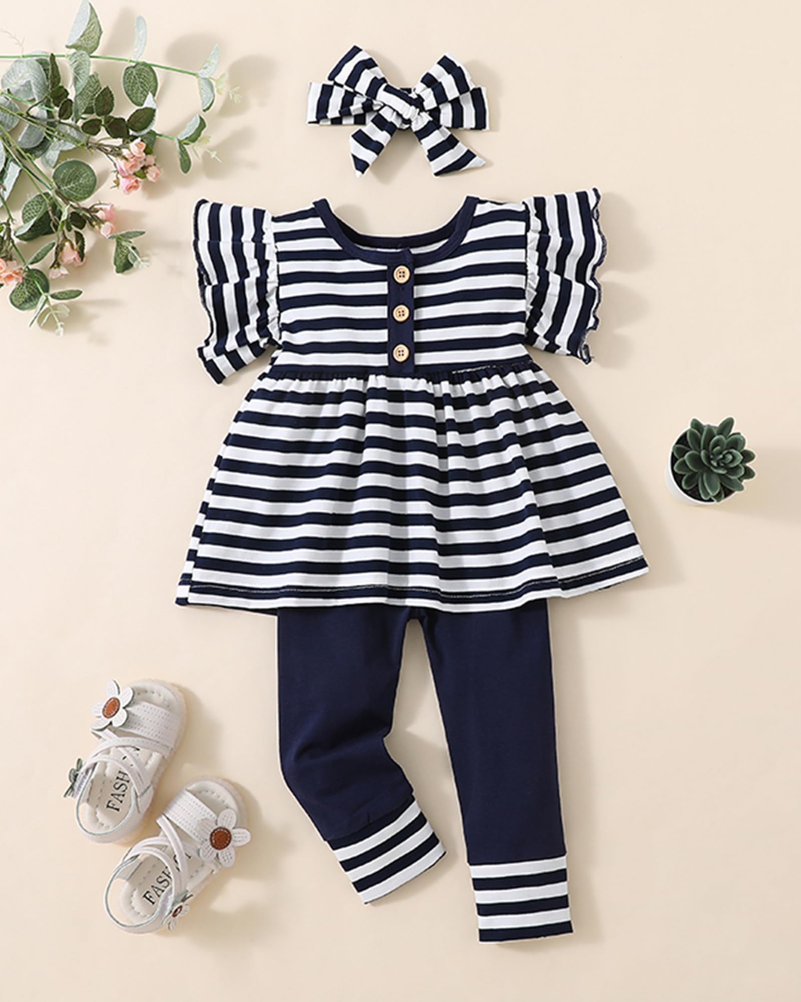 Design: The outfits feature a stylish design with options such as flower, leopard, and stripe ruffle long sleeve shirts, paired with solid color pants. The look is simple yet cute, perfect for any occasion.
