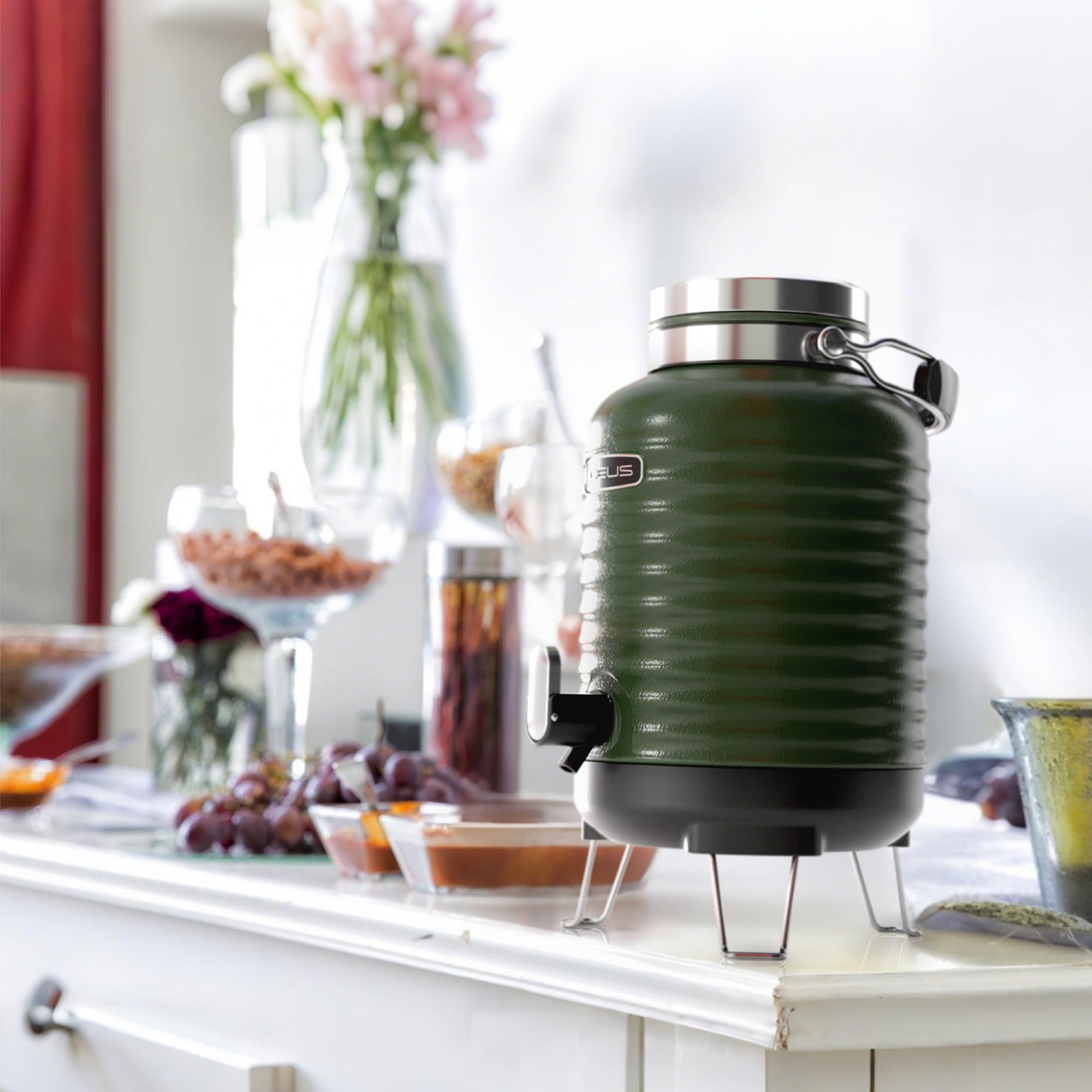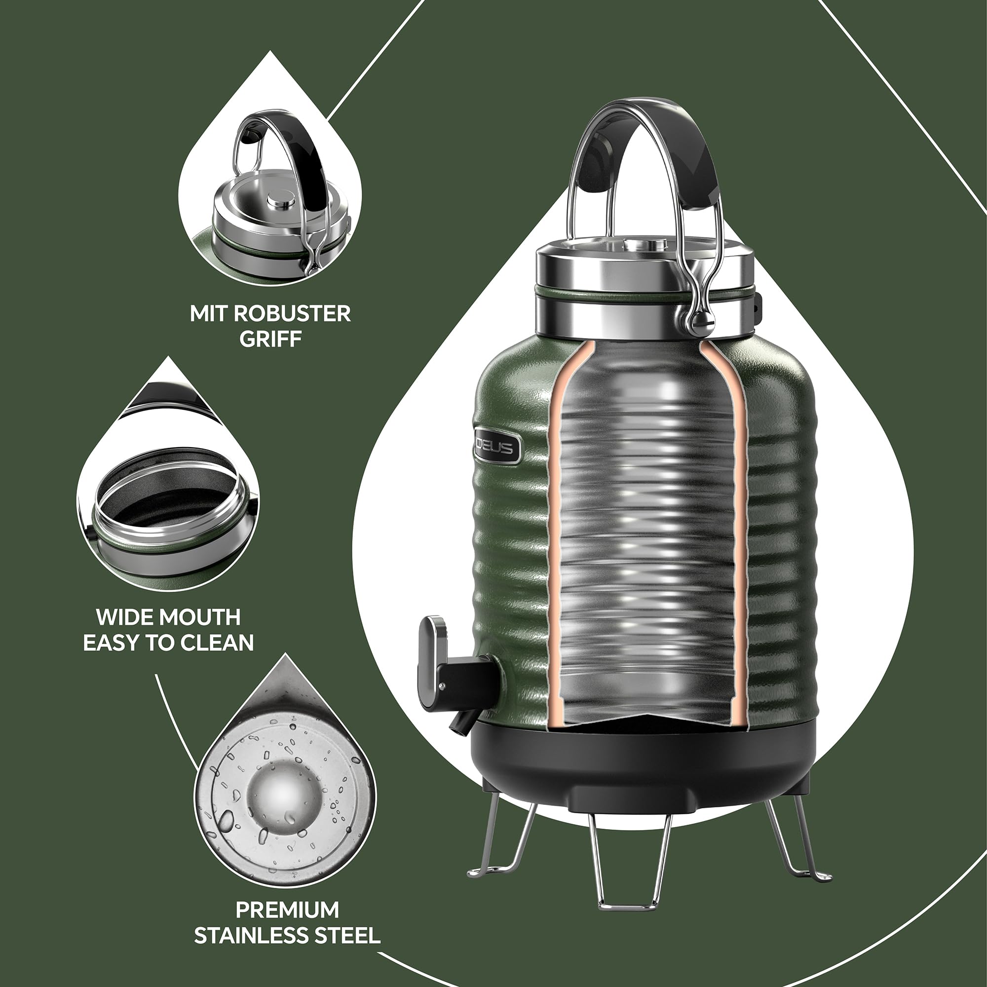 Unique Exterior - All-in-one Designed by professional designers, these beverage dispensers have a unique and elegant appearance which combined wild and modern elements. The powder coating on the surface has very strong scratch resistance. Double-wall stainless steel vacuum insulation allows for maximum temperature retention.