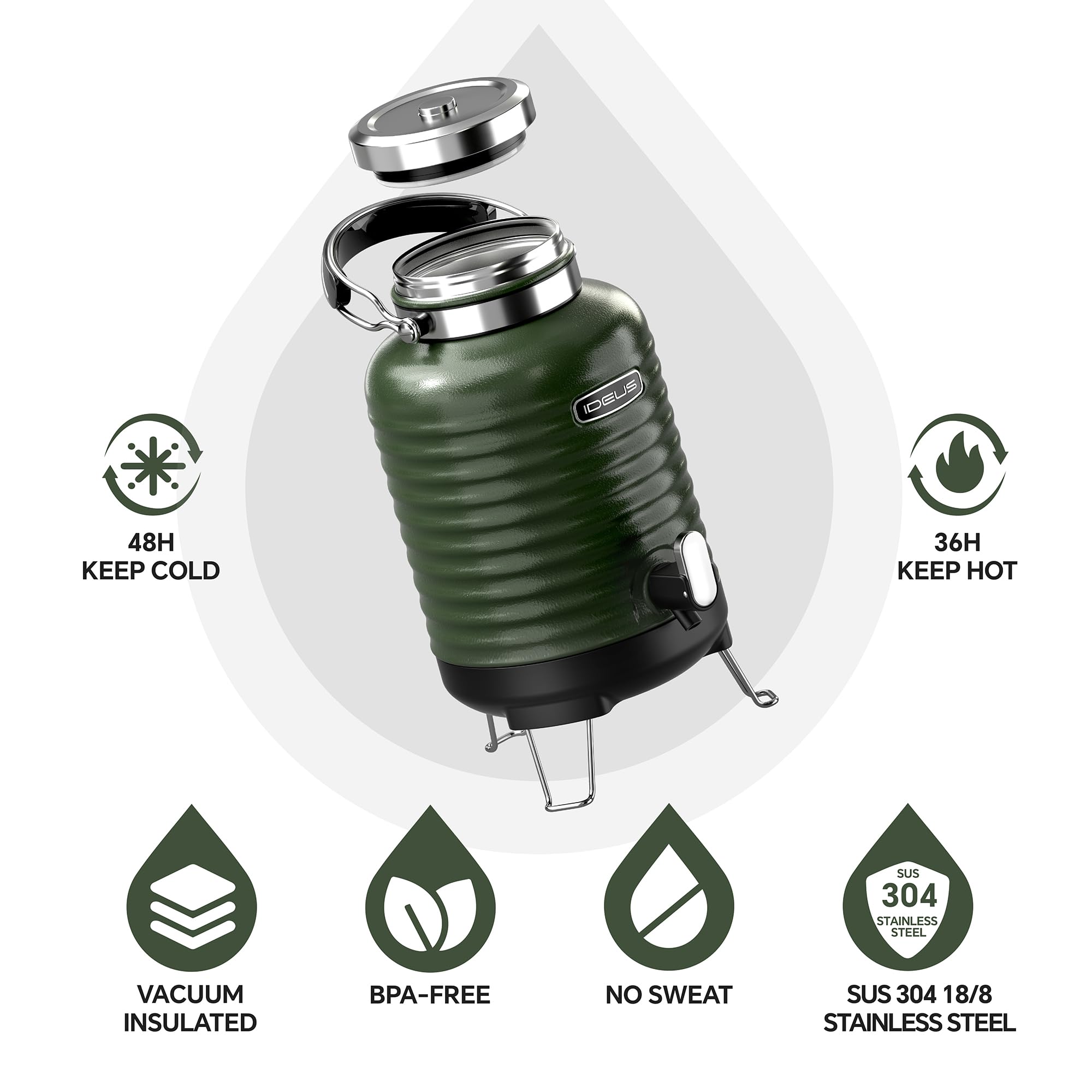 Vacuum Insulation - This type of beverage dispensers from IDEUS is made from SUS304 18/8 stainless steel. 100% BPA-free. Advanced vacuum insulation technology can keep cold for up to 36 hours, keep warm for up to 24 hours, and keep hot for up to 12 hours. With advanced vacuum insulation tech, you can keep the liquids fresh and piping hot/cold.
