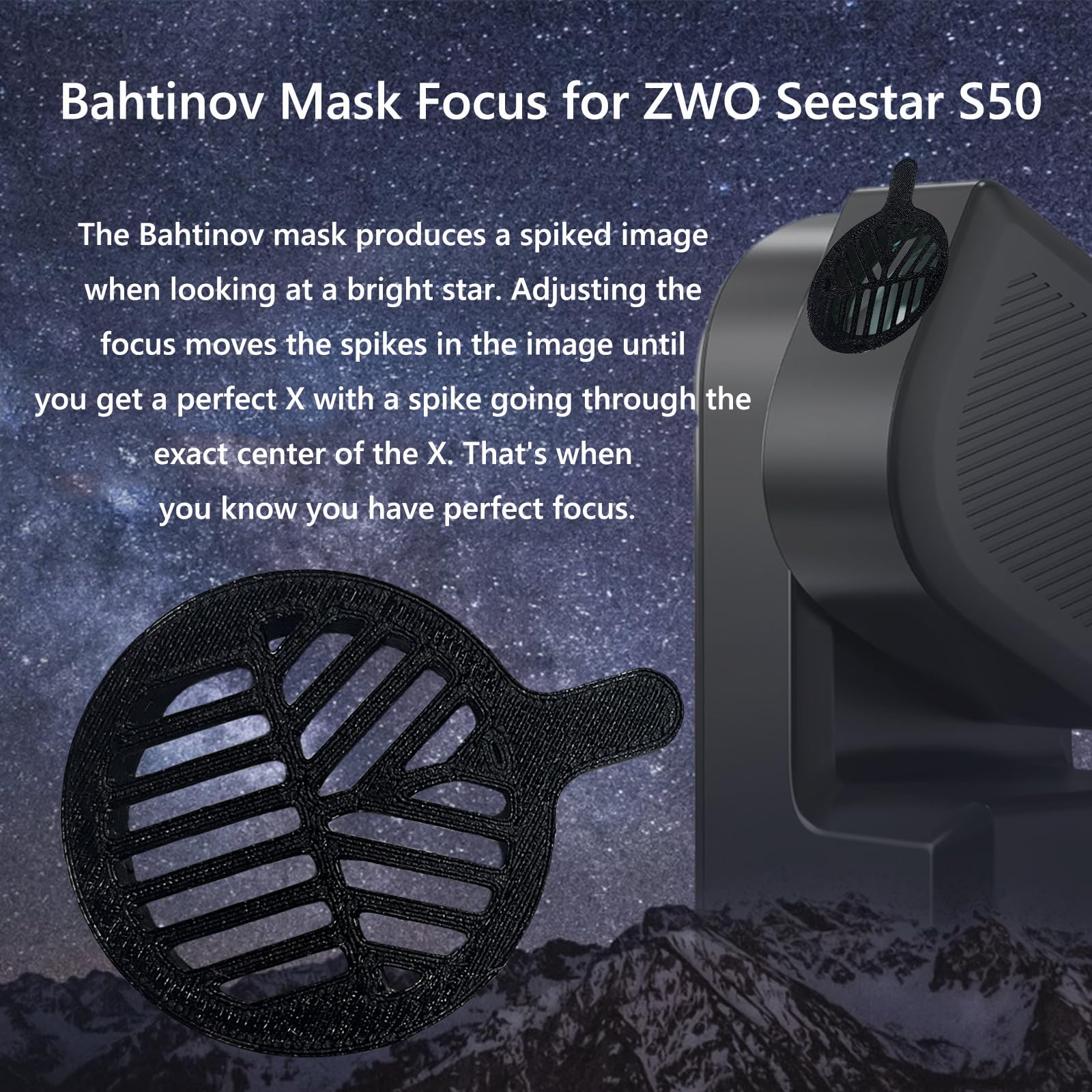 Bahtinov mask for use in the ZWO Seestar S50 telescope, which will allow the user to achieve perfect focus. Currently the firmware does not allow for manual focus, but it's rumored to be a future feature. Push the Bahtinov mask into the front opening of the ZWO Seestar S50 telescope. The Bahtinov mask produces a spiked image when looking at a bright star. Adjusting the focus moves the spikes in the image until you get a perfect X with a spike going through the exact center of the X. That's when you know you have perfect focus.