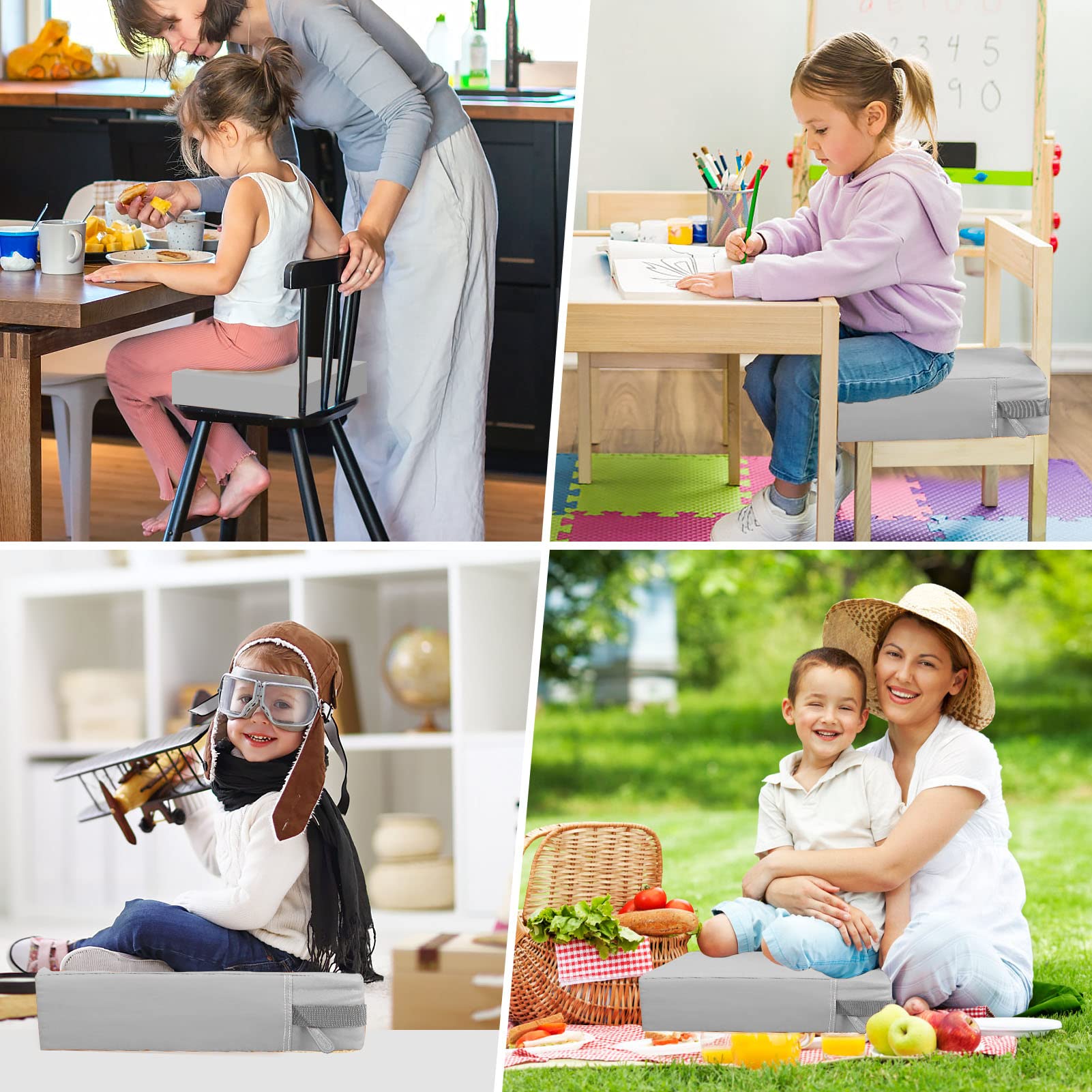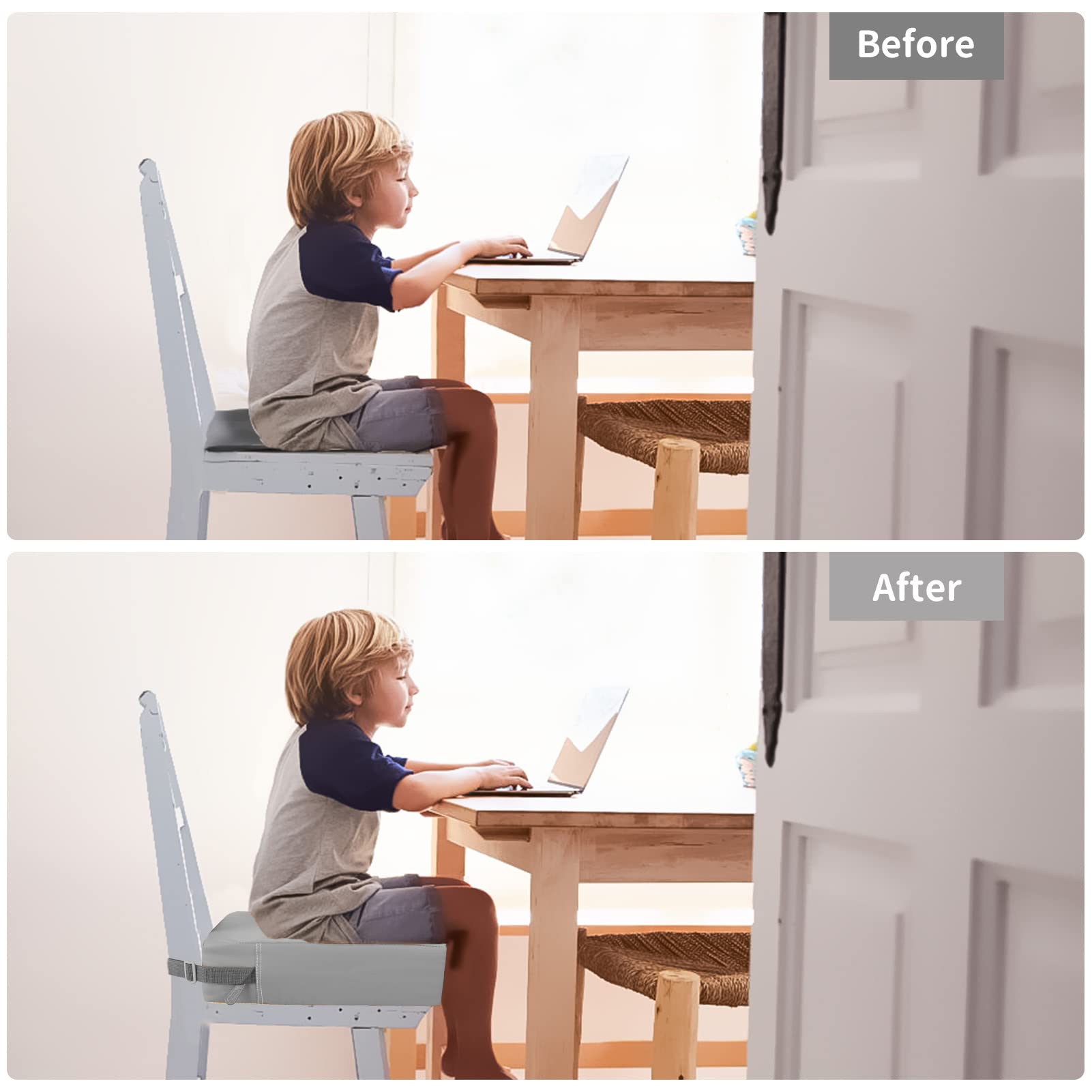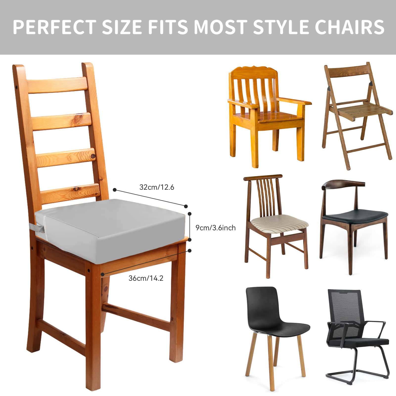 【IMPROVED DESIGN】Compared with other old models on the market, our toddler booster seat has thoughtfully increased the width on the seat cushion, covering the entire surface of the chair more comprehensively; The size of toddler booster seat is 14.2 x 12.6 x 3.5 inches, it is suitable for most dining chairs. And the length of the bottom seat belt is appropriately increased (21.6-31.5 inches), so the cushion can be better fixed on the dining chair