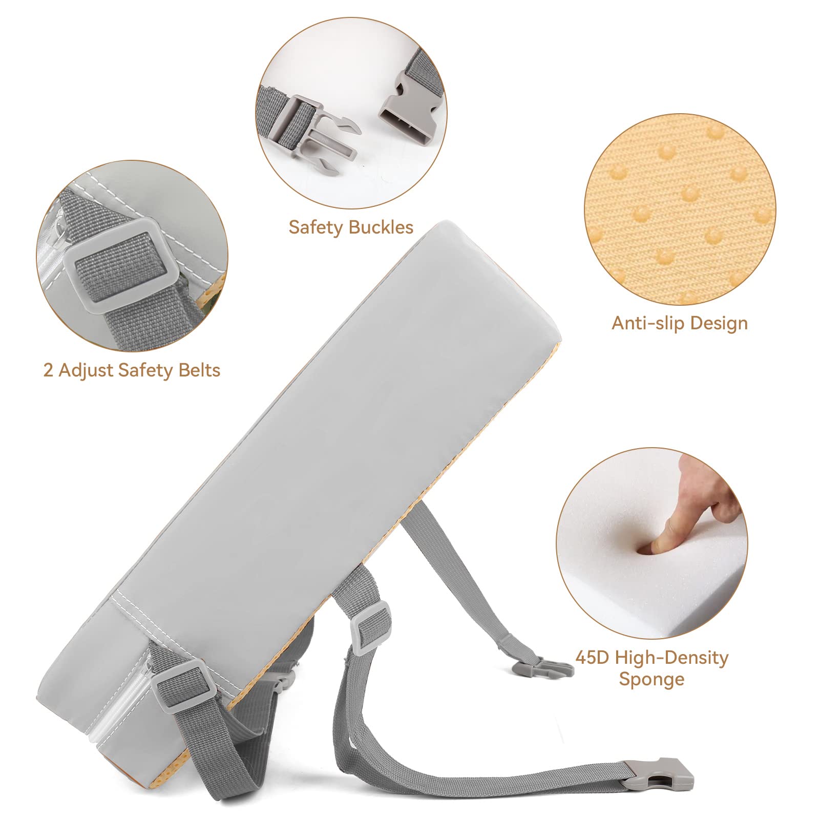 【SAFETY & INSTALLATION】The portable booster seat is designed with two seat belts, which can firmly fix the booster seat cushion to the chair from the bottom and back,the bottom is made of non-slip silicone,so that the booster cushion is not easy to slide,ensure the safety of children when eating on the table.The extend length of two adjustable seat belts is 18 inch-28 inch,so it is suitable for most dining chairs