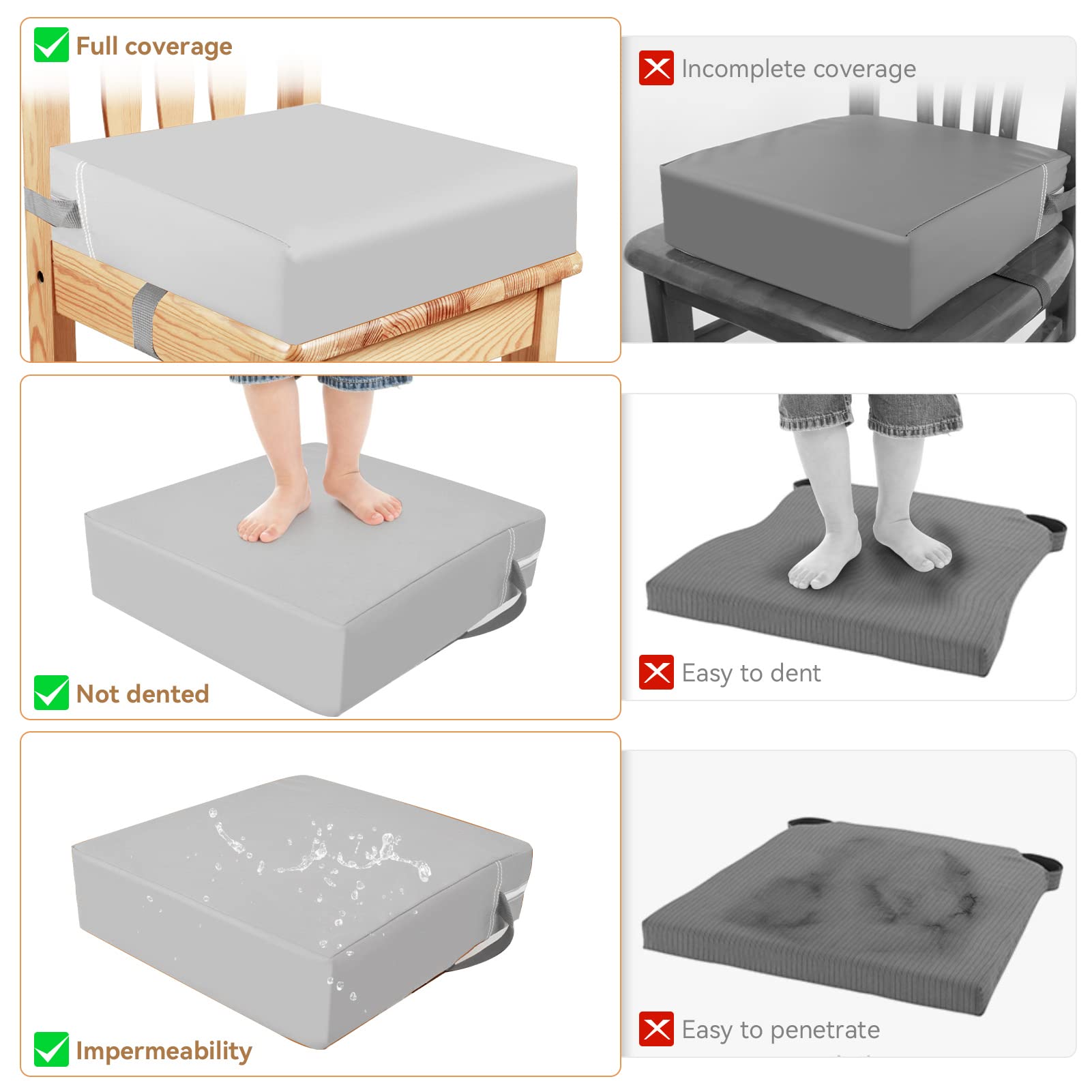 【Exlusive Material】Toddler booster seat for dining table made of high quality PU synthetic leather and soft high-density memory foam, so kids booster cushion is very sturdy and not squashy.It can hold enough weight to make your baby without sinking down,so that they can enjoy the meal comfortably. If drops food on booster seat accidentally, jsut wipe it with a rag
