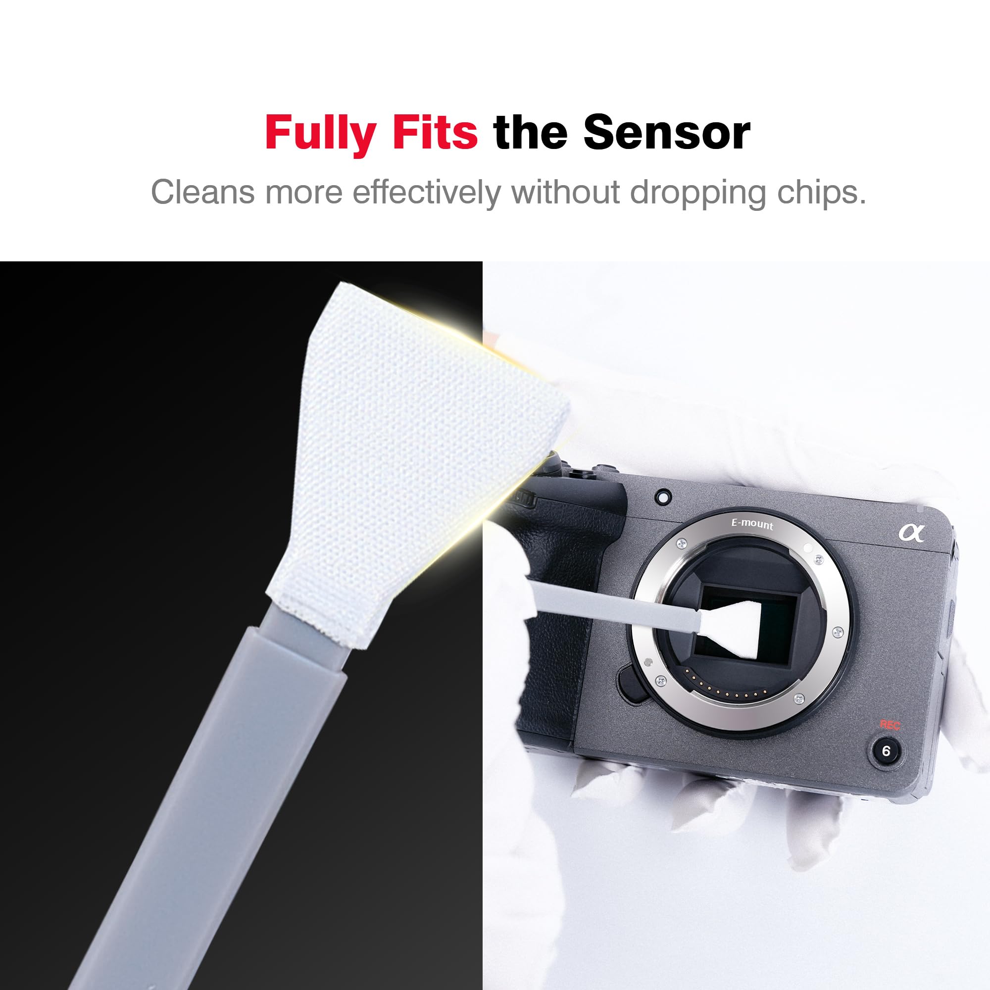 【Precision Cleaning】:Each sensor cleaning swab is produced in a 100% dust-free environment and vacuum-sealed. Its design fits snugly against the sensor to ensure efficient cleaning. The swab head, made from micrometer-level fiber material, absorbs and removes microscopic particles invisible to the naked eye.