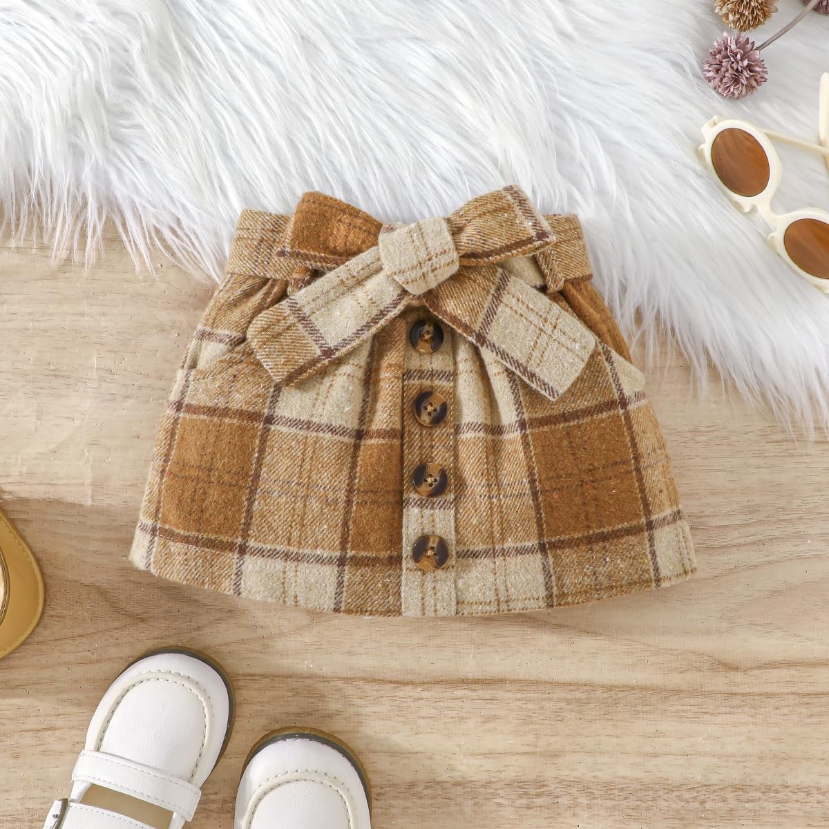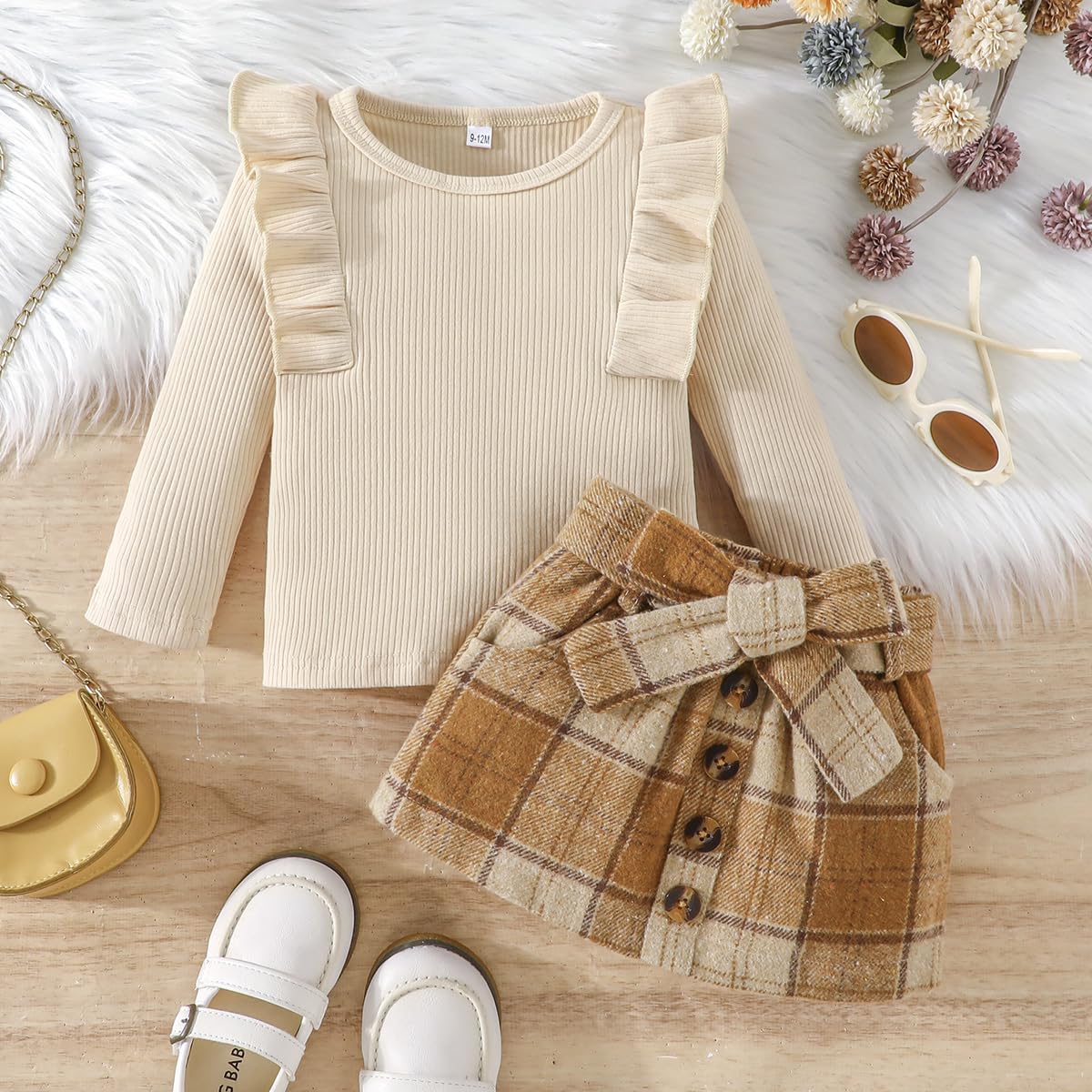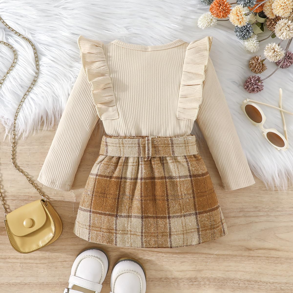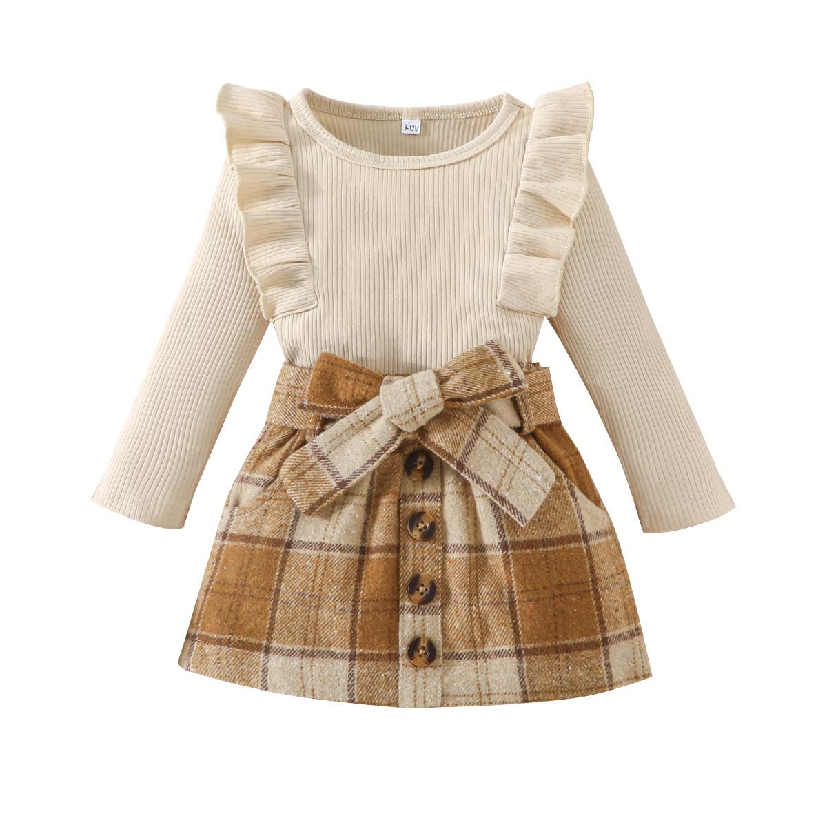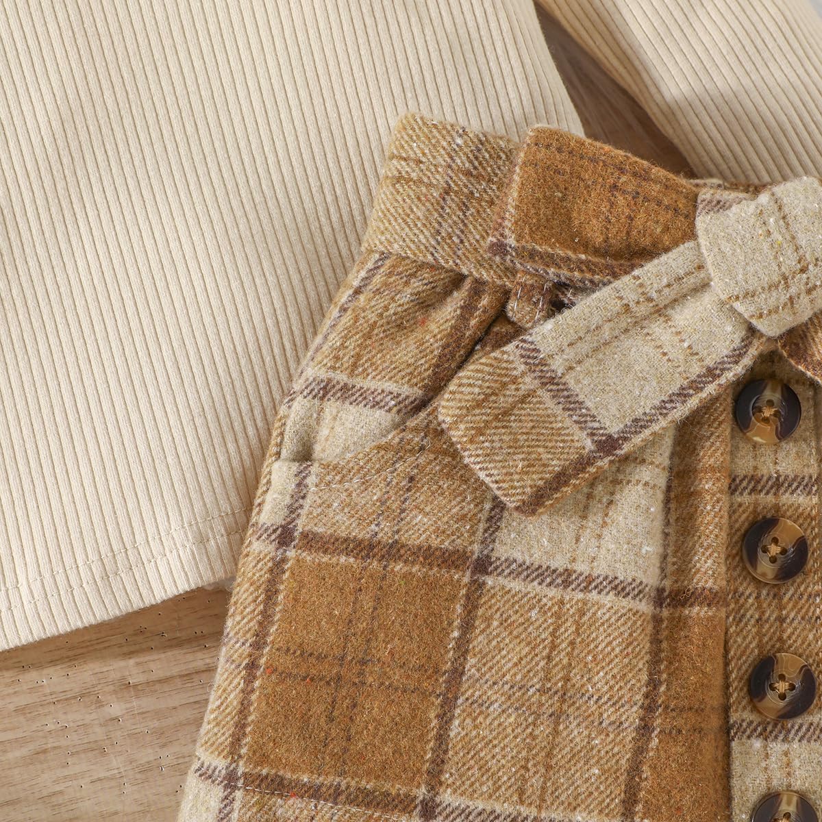 Feature: Baby girl fall outfits, long sleeve knitted sweatshirt top , crewneck, comfy ribbed shirt and tweed red plaid skirt set, adjustable belt skirt, lovely and stylish, Suitable for your little princess in autumn winter and Christmas wear.