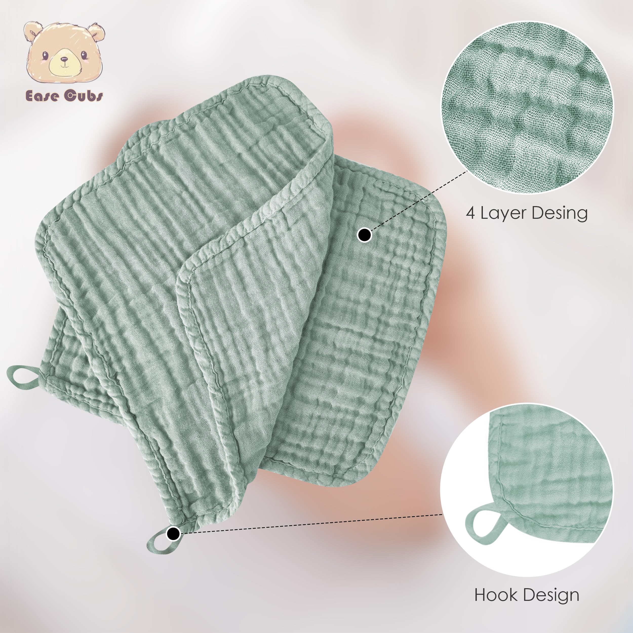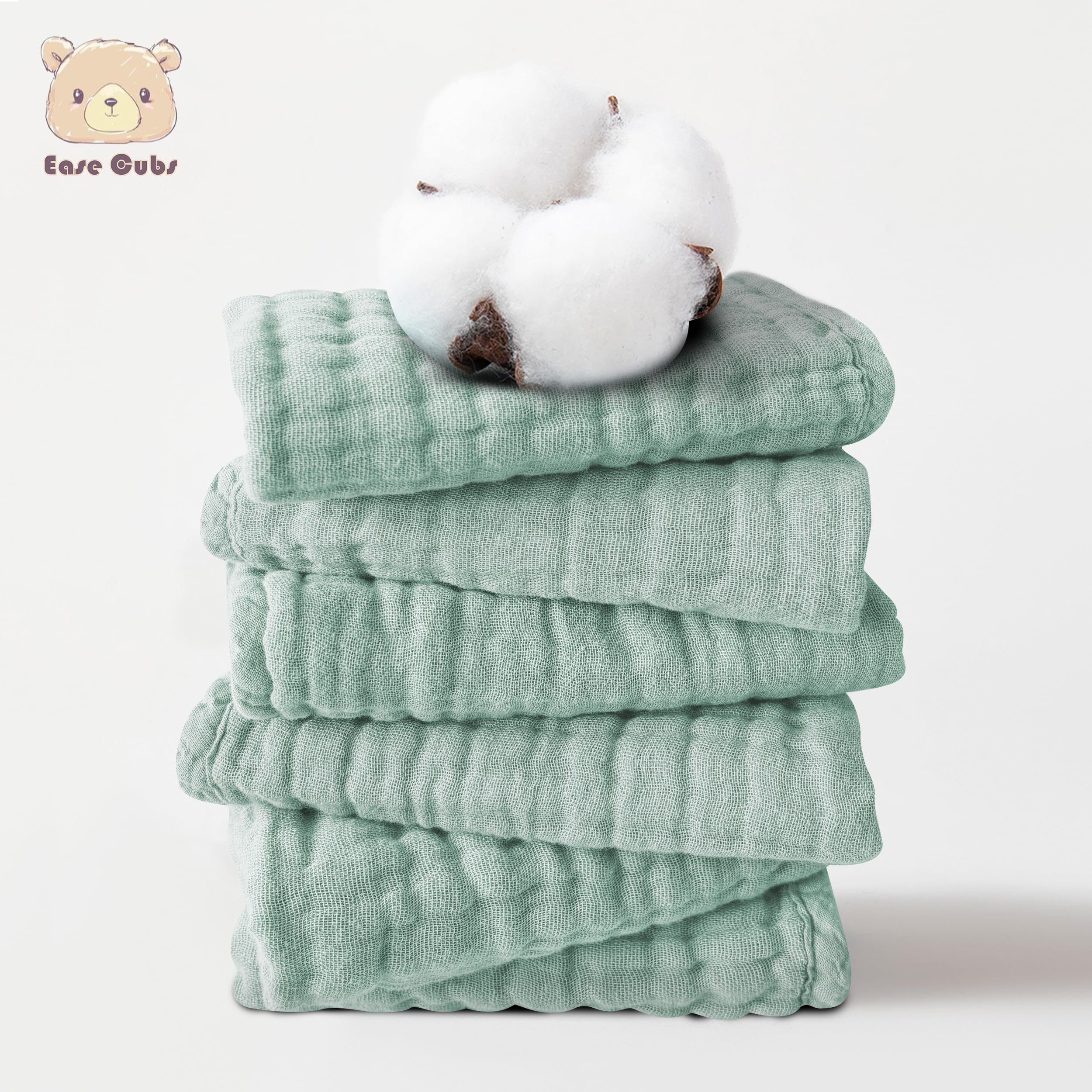 Ease Cubs 12 Pack Muslin Baby Washcloths - 12"x12", Green
