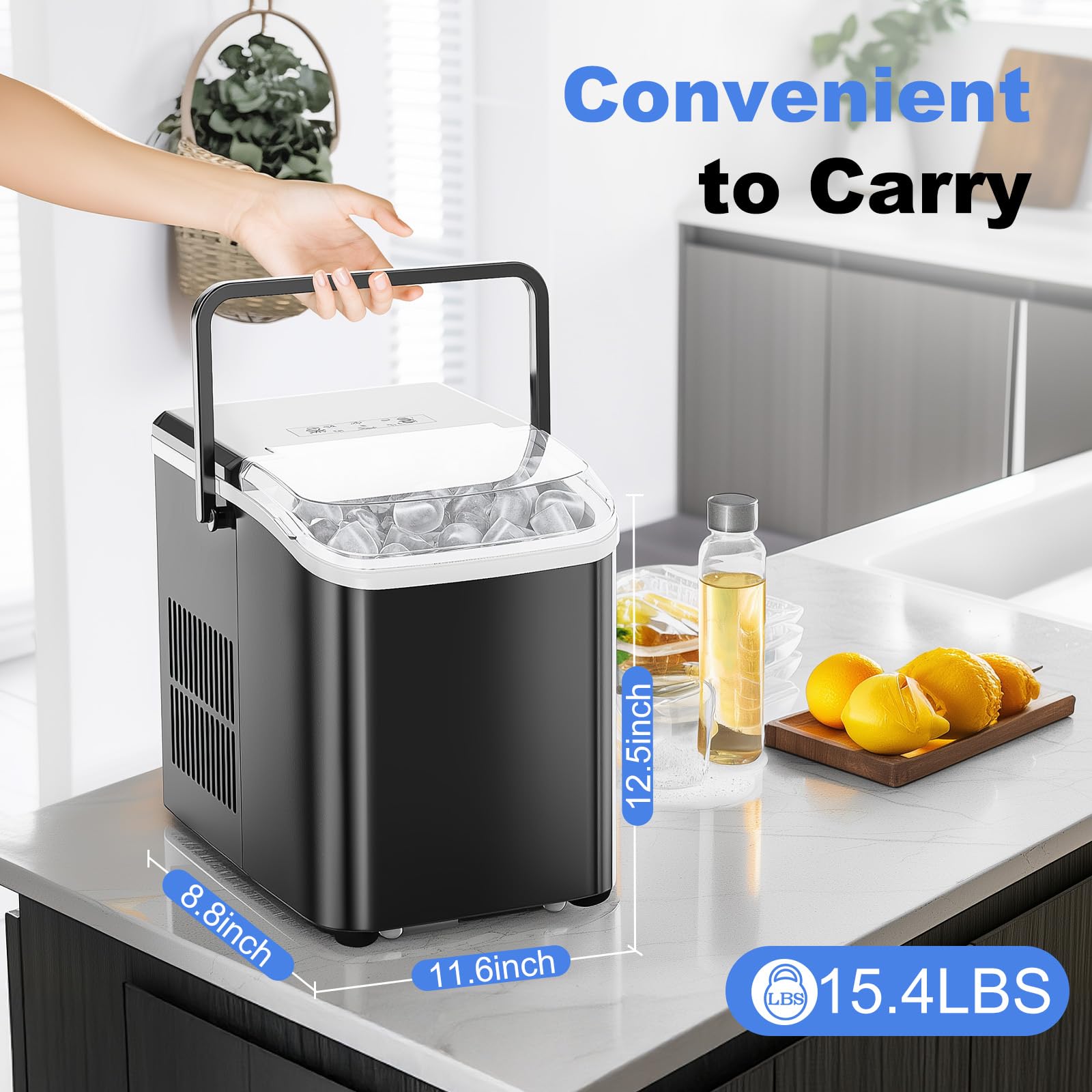【Portable Ice Maker】 The countertop ice maker measures 8.8 x 11.6 x 12.5 inches, 15.4 pounds. and its compact size doesn't take up much space. Our small ice maker comes with a sturdy handle. Easy to carry, this mini ice machine maker countertop can be placed in your kitchen, patio, office or RV.Plus, these bullet ice won't stick together easily or hurt your hands or mouth, making them perfect for cold drinks, iced coffee or chewy snacks!