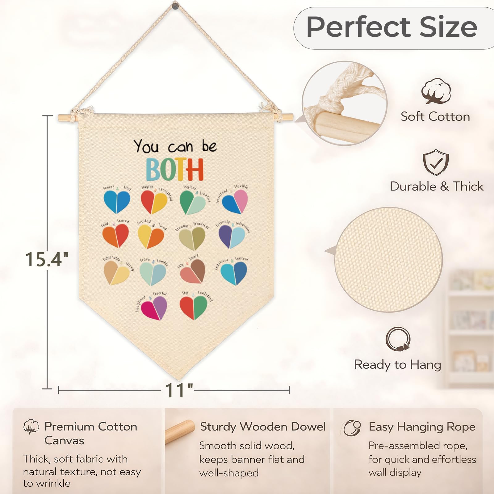Empower the next generation with our You Can Be Both Canvas Hanging Flag. Measuring 15.4 x 11 inches, this vibrant piece of wall art is specifically curated for the modern educational landscape—from bustling kindergarten classrooms to peaceful school counseling suites and dedicated calming corners. Each colorful heart on the banner represents the beautiful complexity of a child's character, reminding them that they can be both smart and kind, bold and scared, or practical and dreamy. Made from premium, heavy-duty cotton canvas and supported by a sturdy 11-inch wooden dowel, this high-quality banner is built to be a lasting visual anchor in any school setting. Whether you are decorating a classroom to celebrate diversity or looking for a professional gift for a fellow educator, this ready-to-hang pennant provides the perfect balance of inspiration and professional decor.