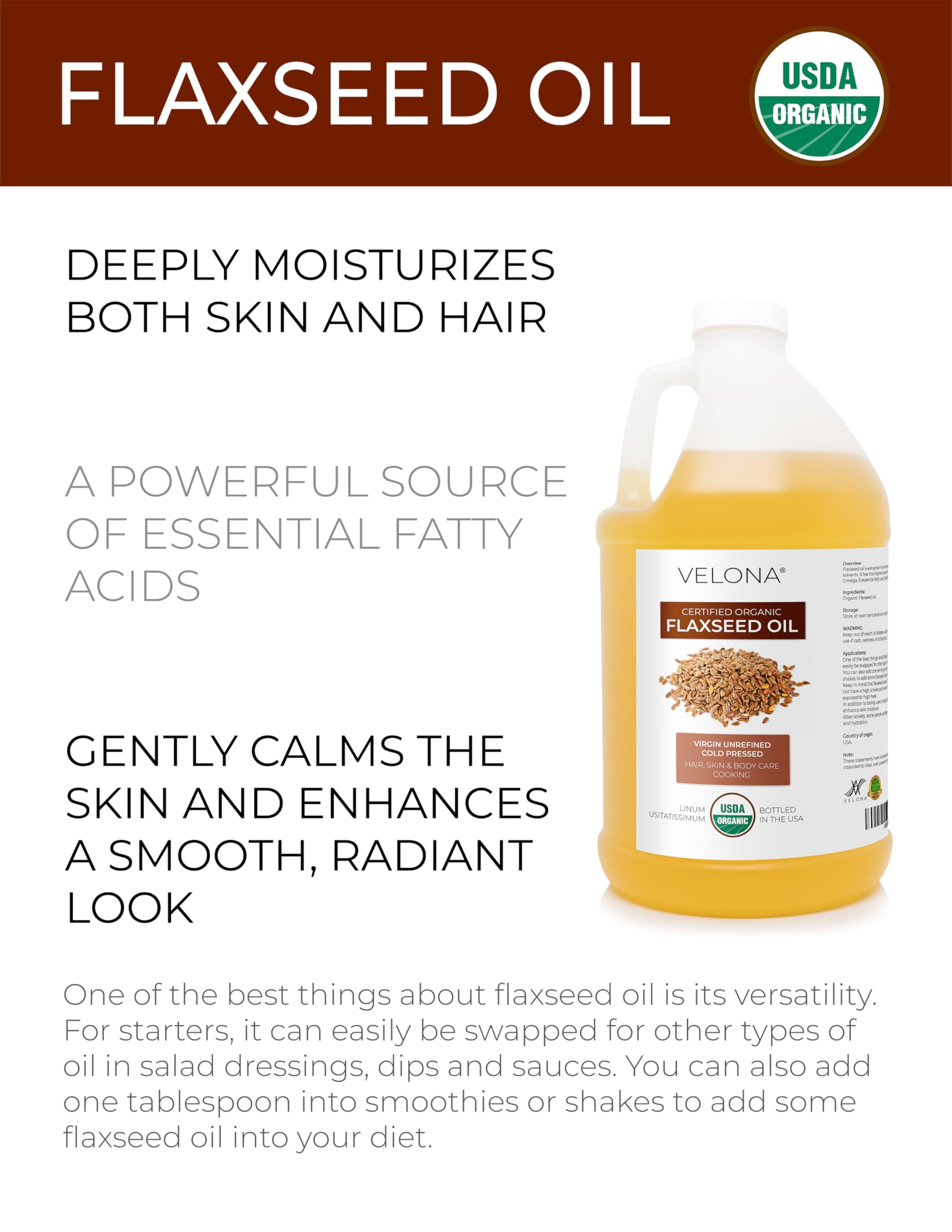 Velona USDA Certified Organic Flaxseed Oil: 100% Pure and Natural Carrier Oil. Unrefined. Cold Pressed. Not Diluted, Non-GMO, No Additives, No Fragrance, Chemical Free, Alcohol Free.