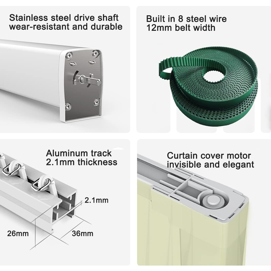 HIGHER GRADED QUALITY: ①Motorized curtain rods made of thickened aluminum alloy; ②Belt built-in 8 steel wire and 12mm width; ③Higher quality load bearing runners and stainless accessories; ④DC motor starts and stops gently.