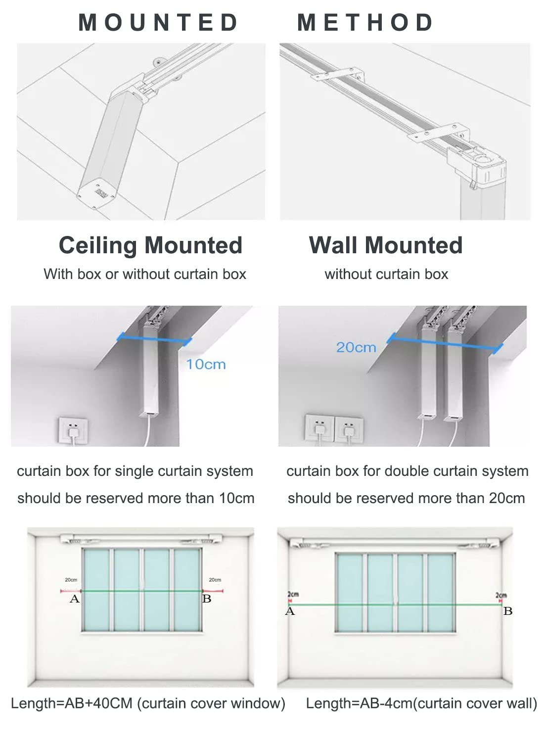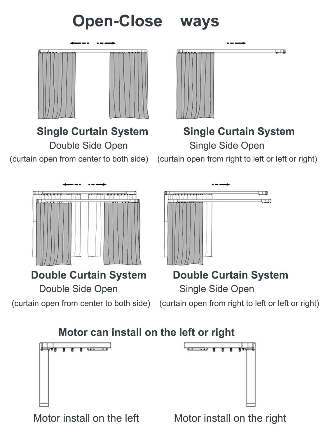 WIDE RANGE APPLICATION: ①We can customize tracks to fit any window size up to 86 inches; ②Ceiling mounting and wall mounting options; ③Three installation choices: central, left, and right opening; ④The motor is hidden, curtains overlap in the middle, no leakage.