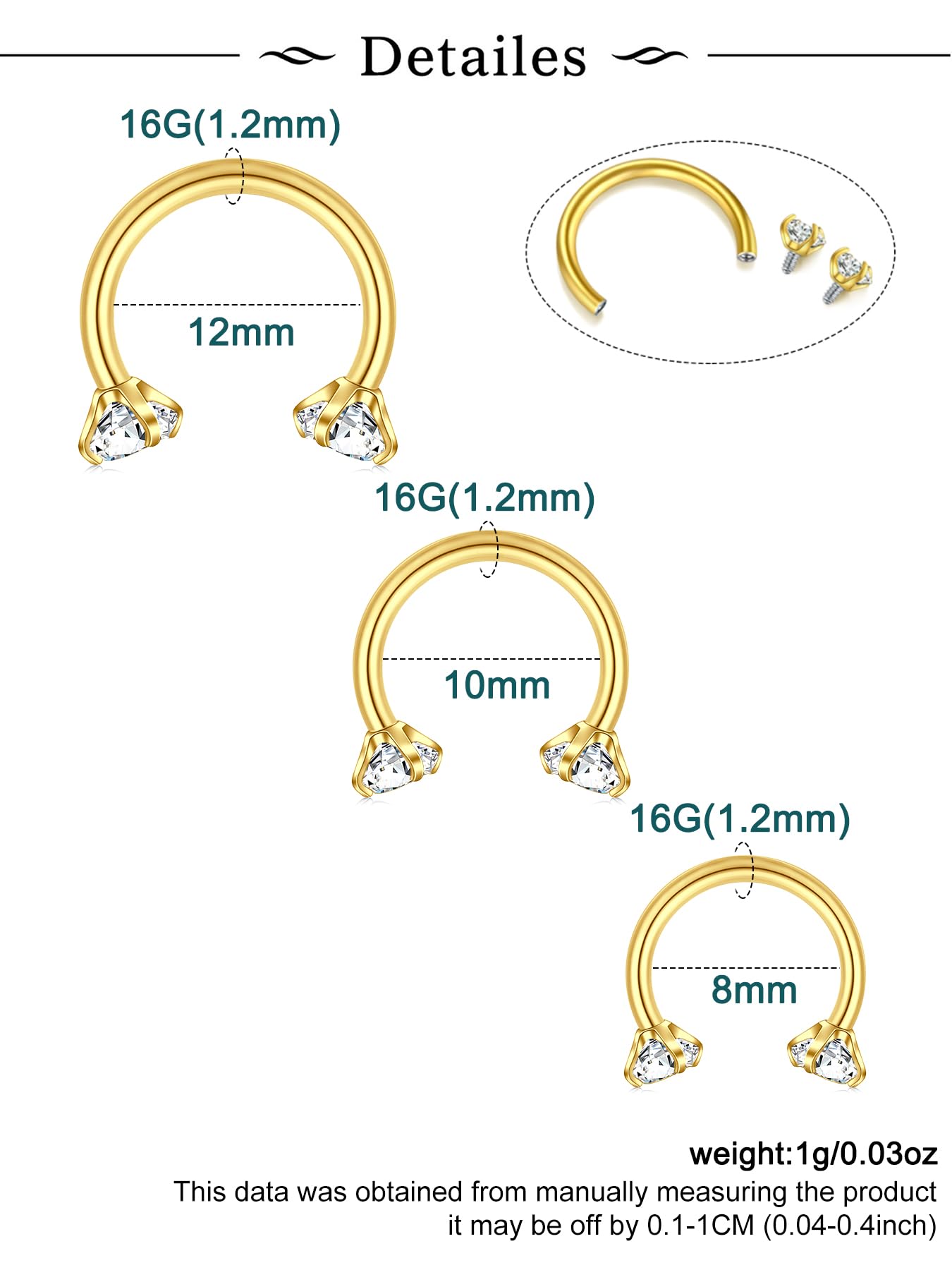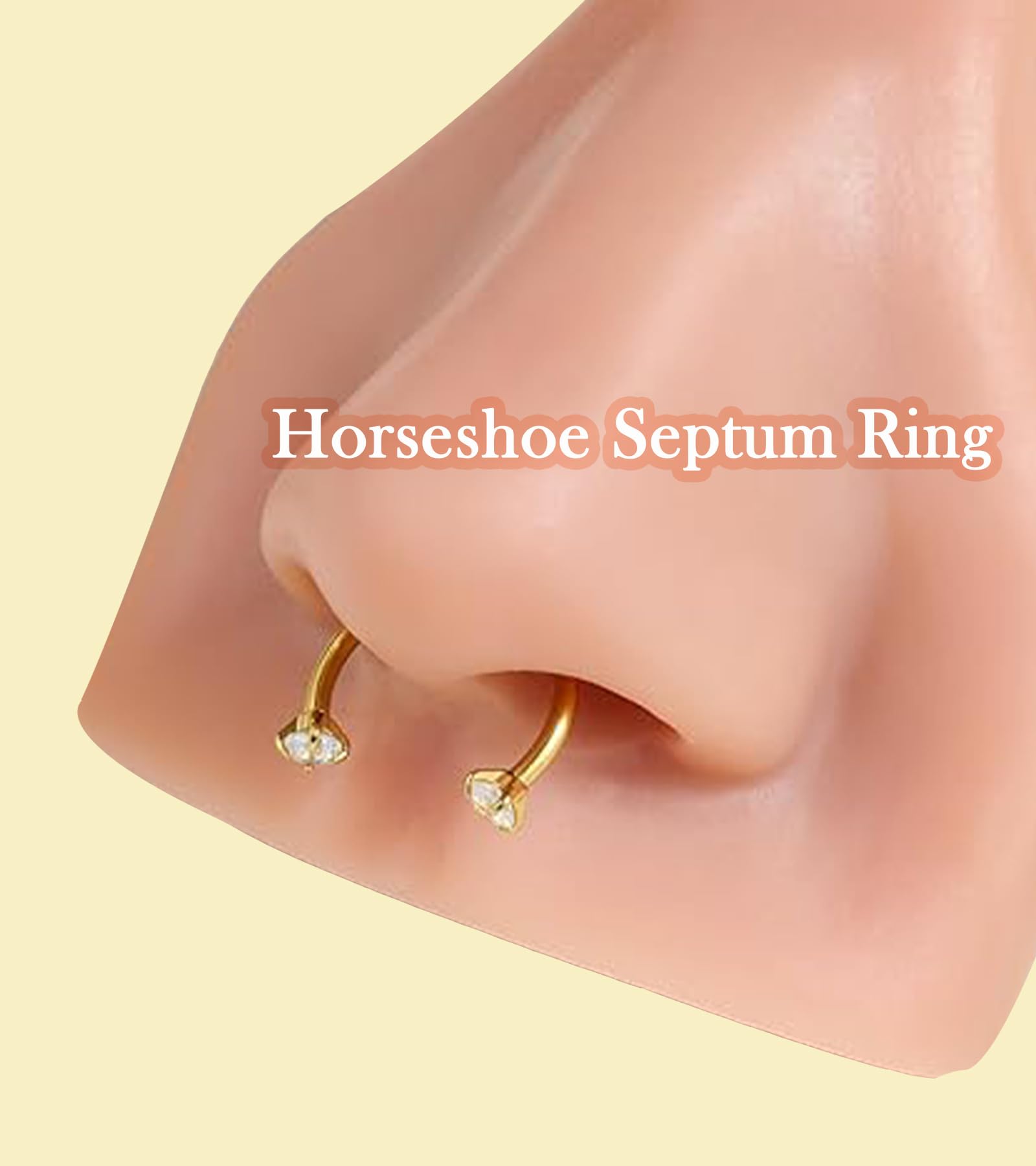 Measurements - gold septum ring septum jewelry 16g (1.2mm), horseshoe septum piercings septum nose ring inner diameter: 5/16"(8mm), 3/8"(10mm), 1/2"(12mm), gold horseshoe septum ring double gem horseshoe nose septum ring gem size : 3mm;