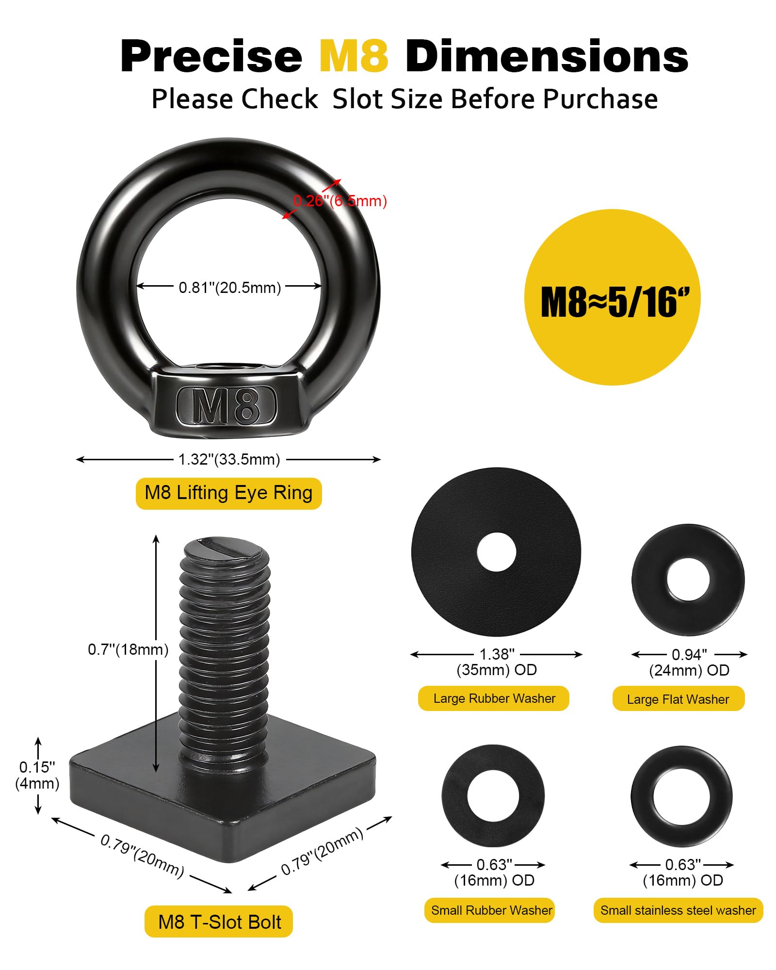 T Bolt with Eye Nut and Washer Utility Tie Down Anchoring Kit Great t bolt eye nut kit to make attach points on your kayak tracks, roof rack, truck bed, and more Heavy Duty Hardware These tie down rings and t bolts are made of premium quality 304 stainless steel to keep them from rusting Easy to Use Just need to slid the t bolt into your t-track crossbar, and tighten the female thread eye nut Spec Material: 304 Stainless Steel Thread Size: M8 T-slot Bolt Head: 0.79 in x 0.79 in x 0.16 in / 20mm x 20mm x 4mm (L x W x Thickness) Shank Length: 0.7 in / 18mm Mounting Type: Tie Down Mount, Roof Mount, Crossbar Mount Features: Heavy Duty, Anti-rust Package Content 4 x M8 T-slot bolts 4 x M8 Eyelets 4 x Washer Or 8 x M8 T-slot bolts 8 x M8 Eyelets 8 x Washer