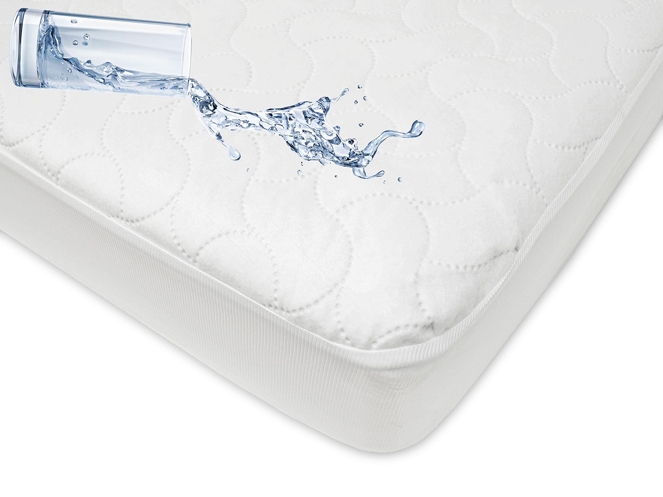 The waterproof crib and toddler protective cover has a top and bottom layer made of soft polyester material with a waterproof layer. The cover is quilted for baby's ultimate comfort and provides protection of the mattress and bedding. The fitted cover measures 28 inches in width x 52 inches in length x 9 inches in height and fits standard size crib and toddler mattresses. With elastic all around that fits the mattress snugly and securely. Machine washable, tumble dry low for best results.