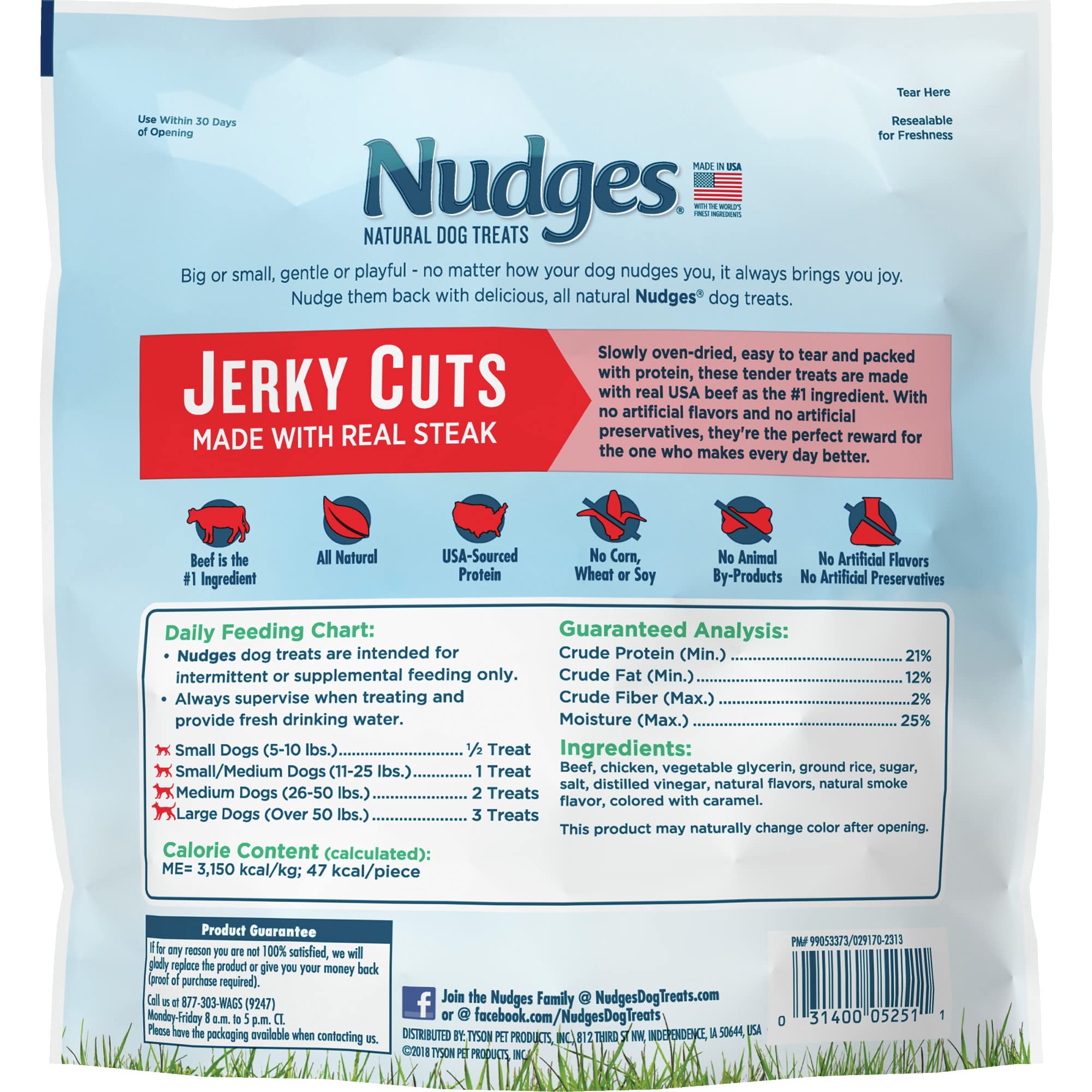 PACKAGING MAY VARY: Contains one (1) 16oz bag of BLUE Nudges Jerky Cuts Natural Dog Treats, Beef